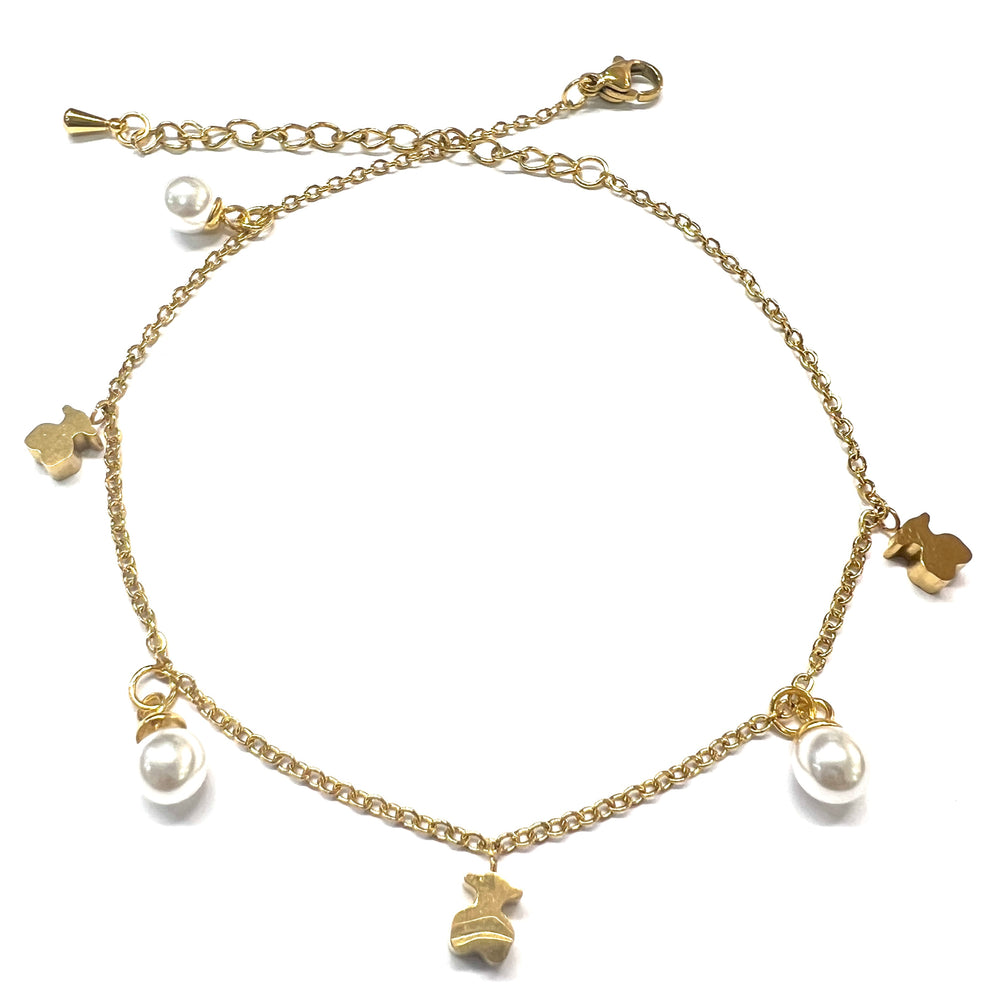 Tobillera Acero oso y perlas Dorada🧸