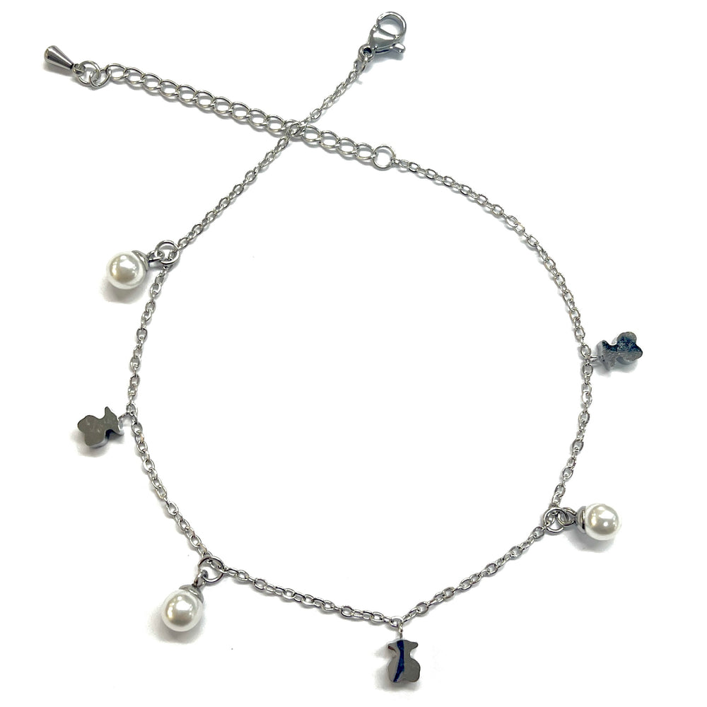 Tobillera Acero Oso y Perlas Plateada🧸