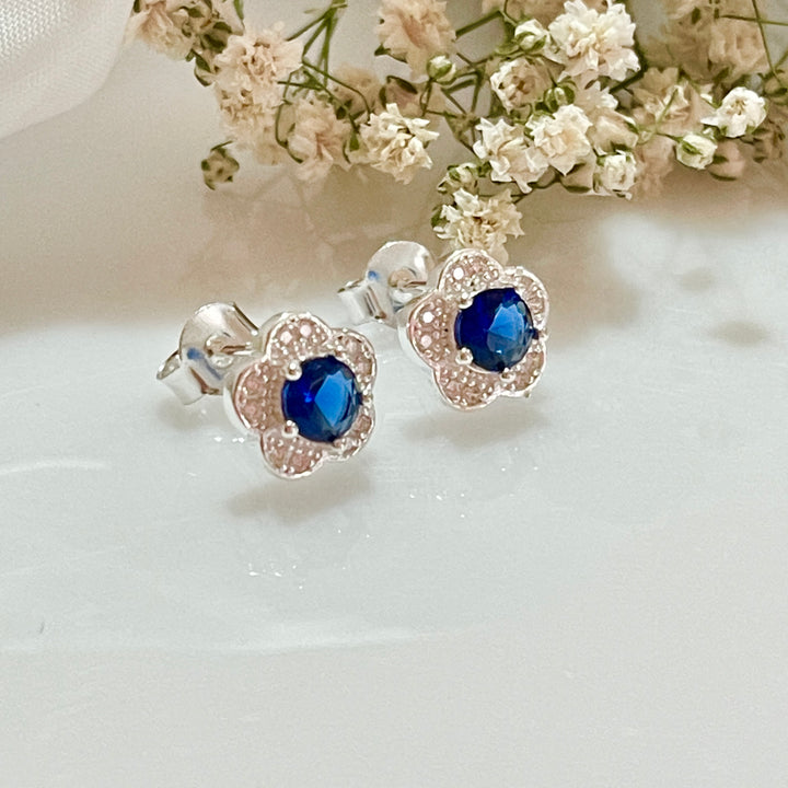 Aretes de Plata Flor Circonita Azul 10MM | Nicola Joyería