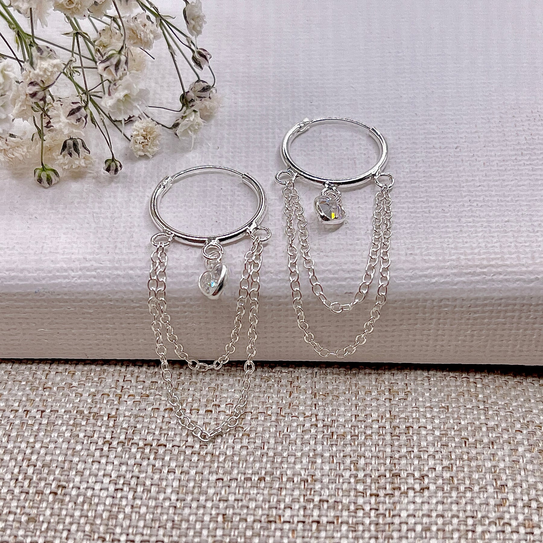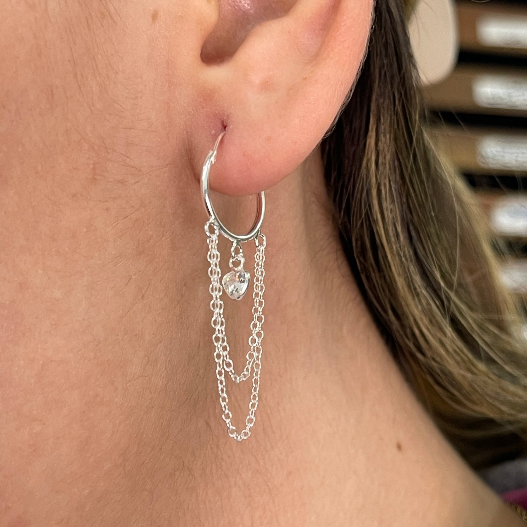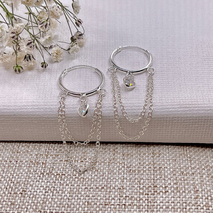 Estas argollas con bonitos dijes de corazón blanco y delicadas cadenas darán un toque encantador a cualquier conjunto.
