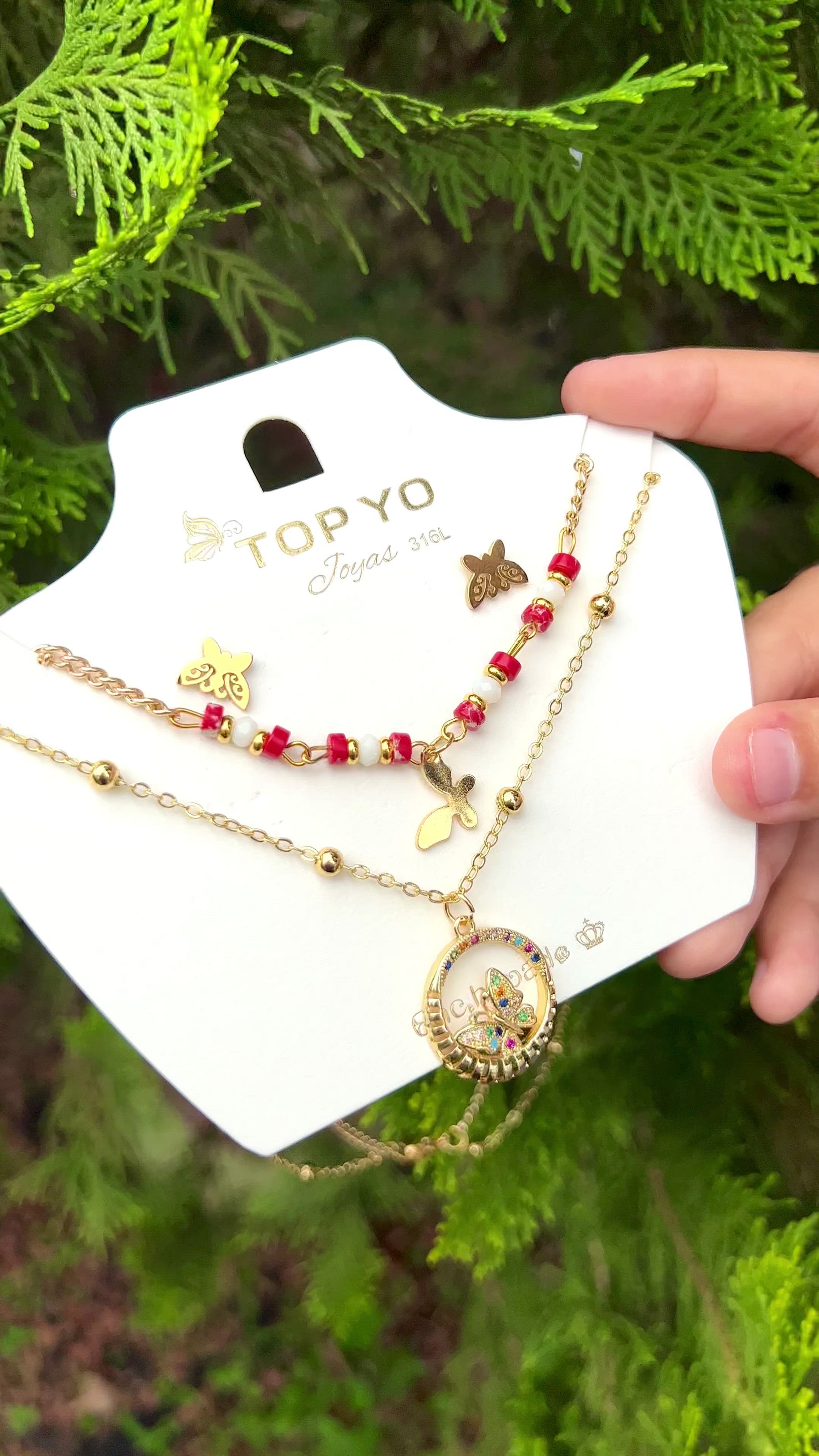 Juego de acero inoxidable dorado doble con mariposas. Incluye aretes.
