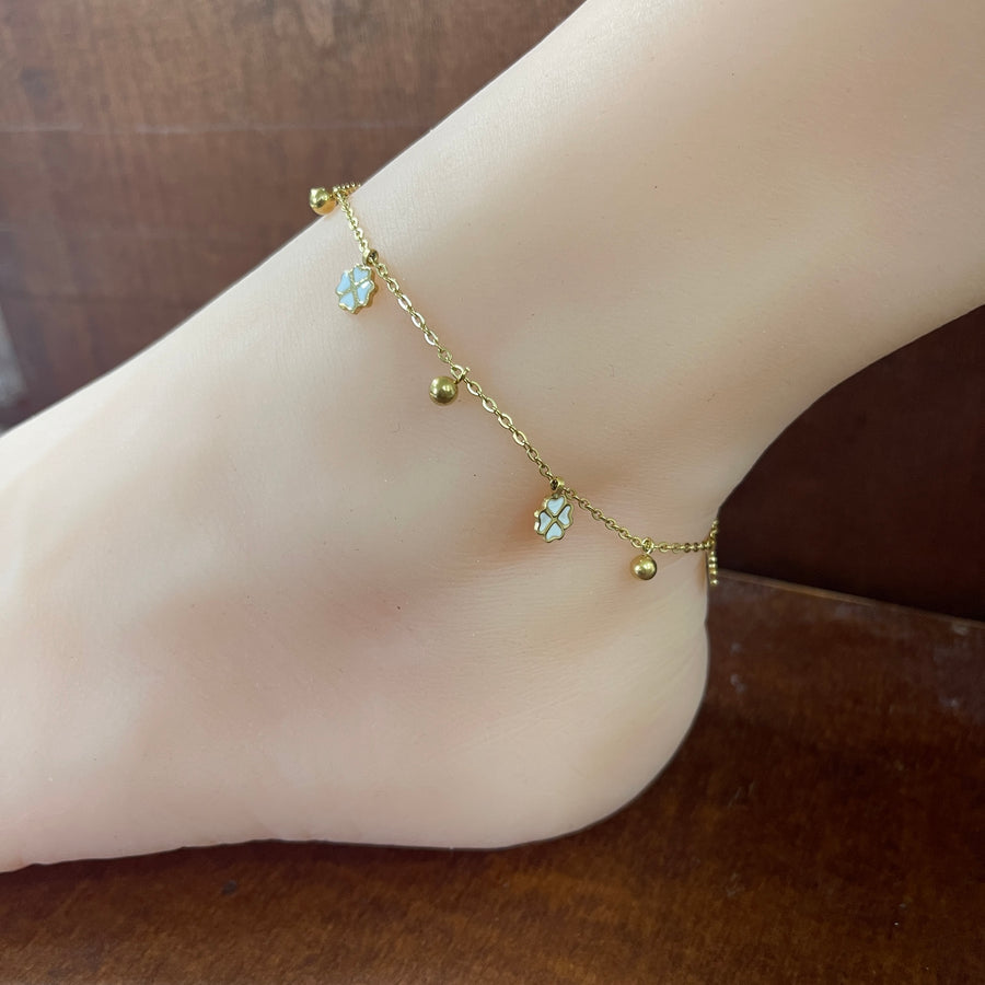 Tobillera Acero Dorada Tréboles Blancas🍀