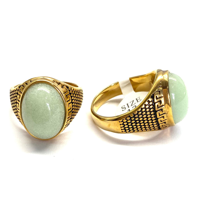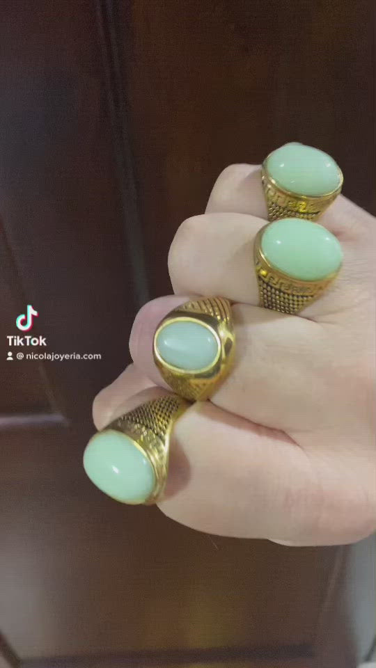 Anillo de Acero con Piedra Verde Brilla en la Oscuridad con labrado griego.