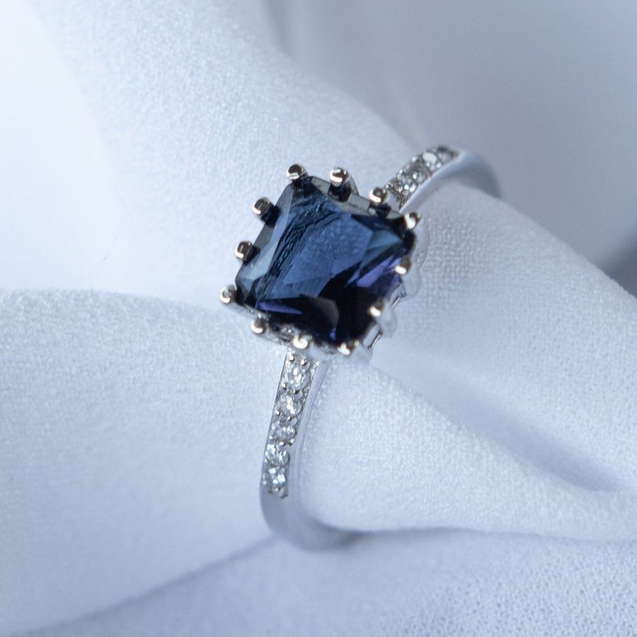 Anillo con zirconia azul cuadrada, brillante, hermoso y elegante.