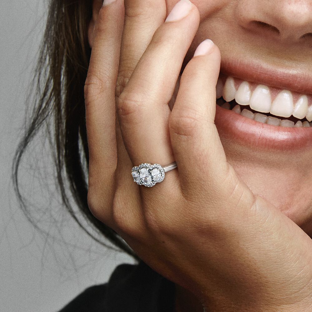 Dale un toque sofisticado a cualquier look con el Anillo Vintage Tres Piedras. Acabado a mano en plata de primera ley, este anillo se presenta con una gran gema central ovalada adornada en ambos lados por dos circonitas cúbicas con talla ovalada. Un halo de pavé enmarca las tres gemas, mientras que una fina banda y los laterales abiertos de la cesta que sostiene las gemas, aportan al anillo un look delicado. Combina este anillo con otros estilos acabados a mano en otros tonos metálicos para crear un llamativo look metálico combinado.