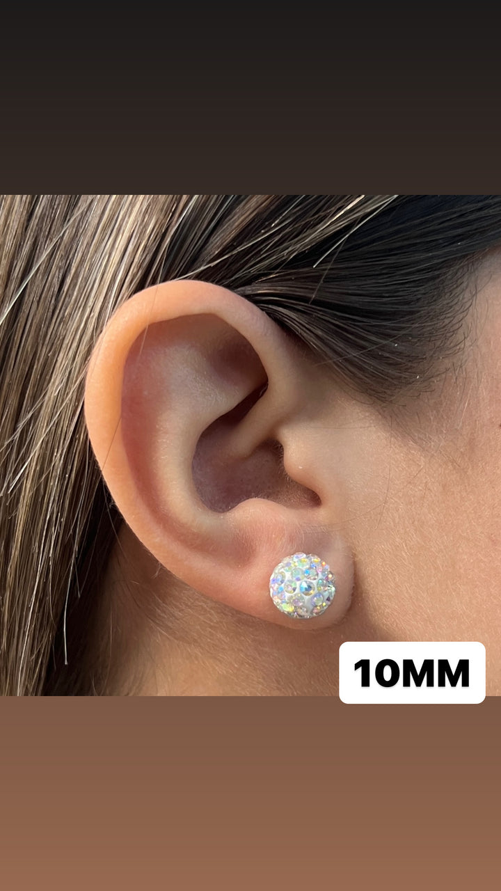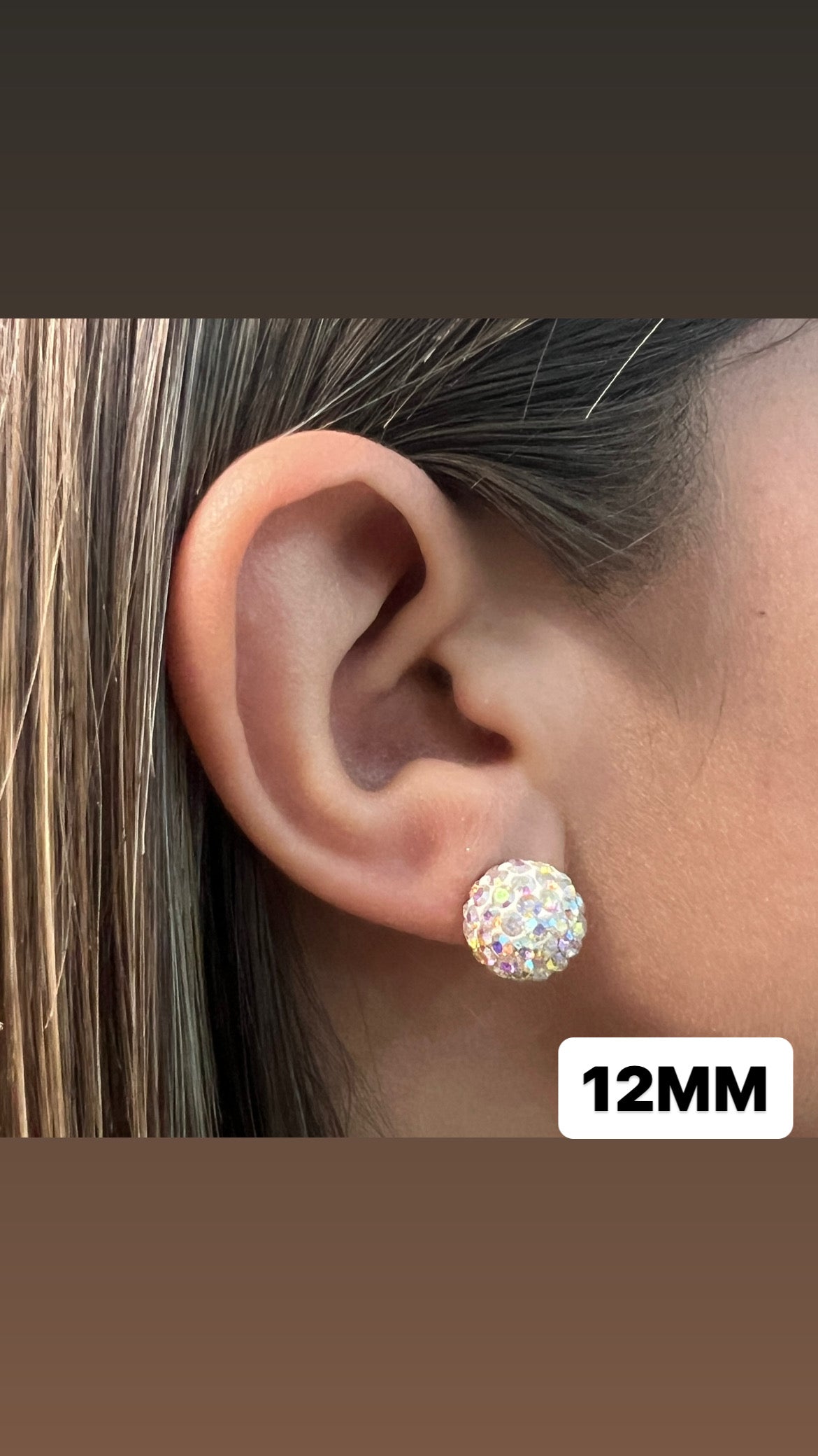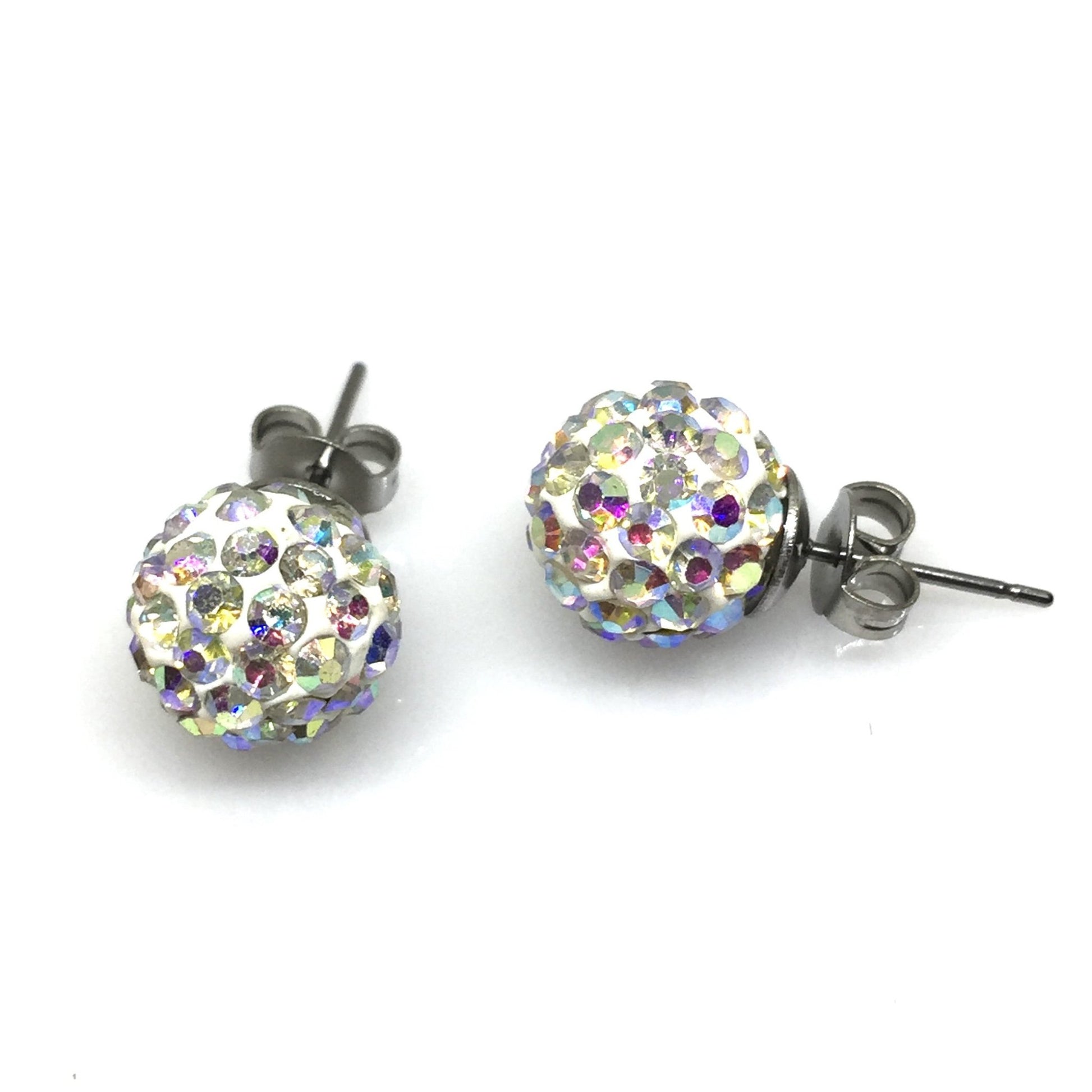 Aretes de acero inoxidable plateado de bola de fuego color tornasol