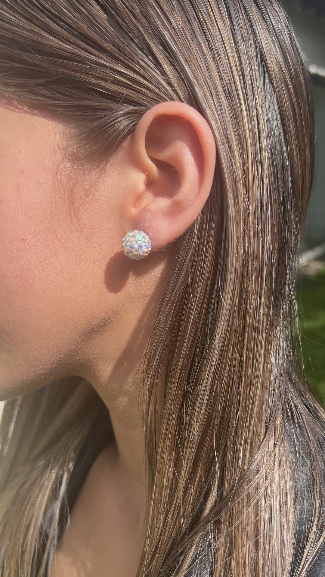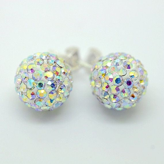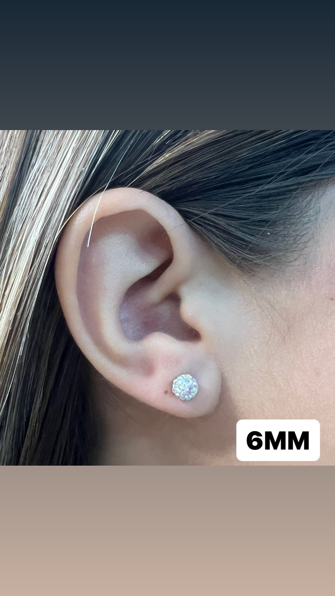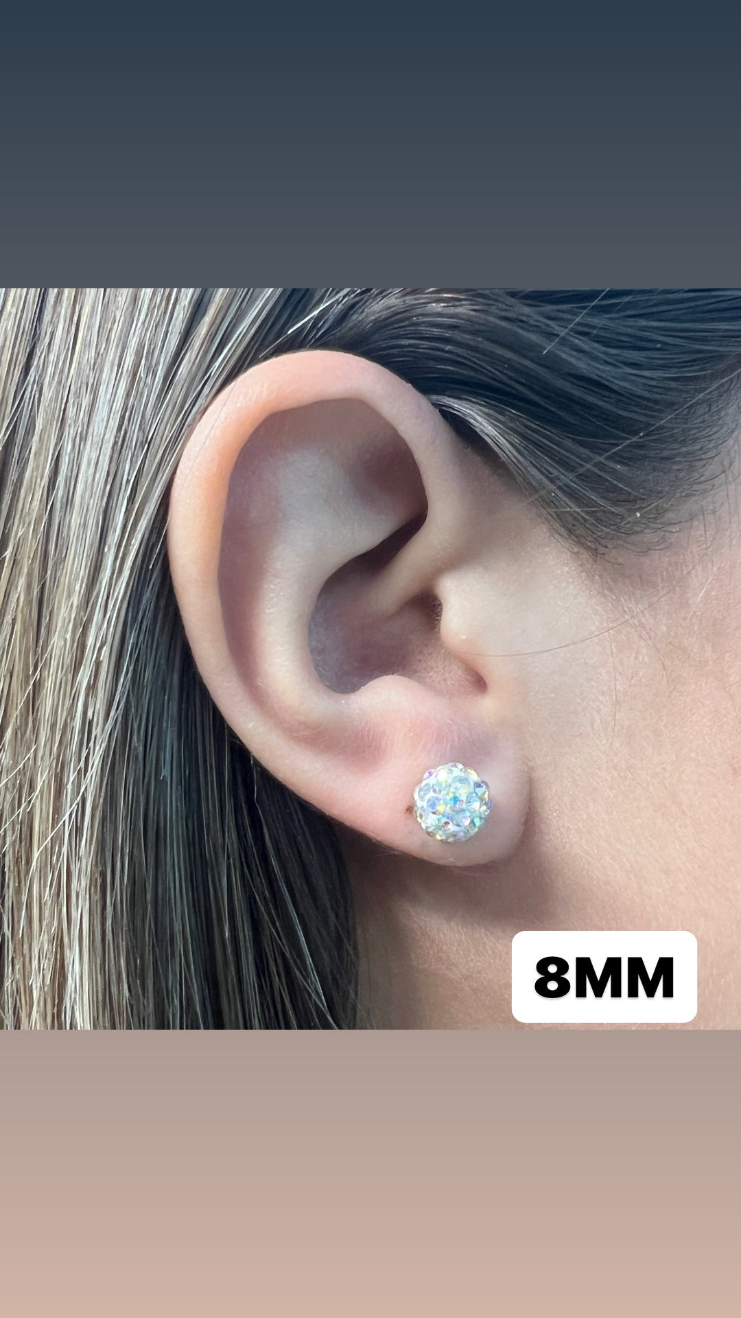 Aretes de acero inoxidable plateado de bola de fuego color tornasol