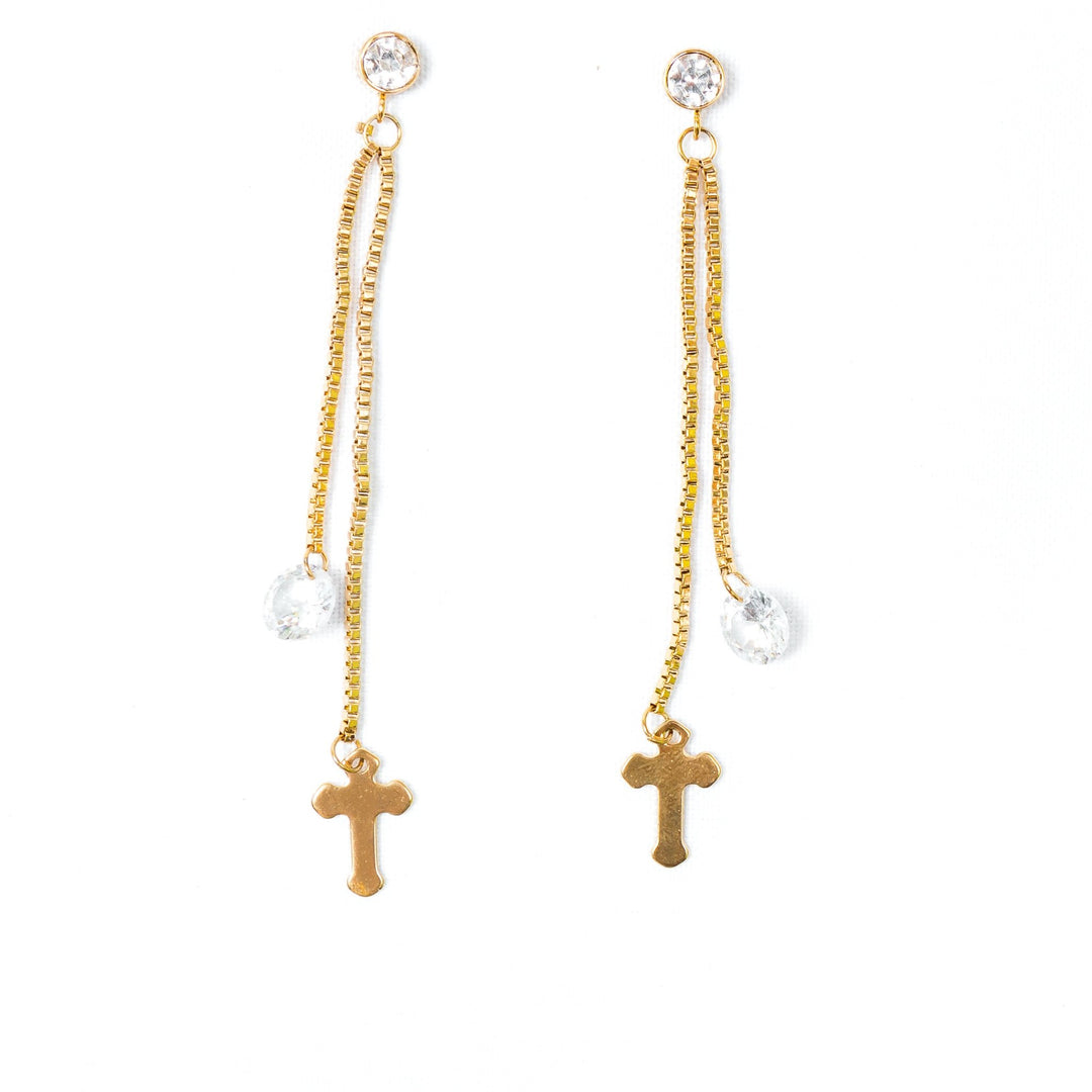 Aretes largos de acero inoxidable dorados con dijes de cruz.