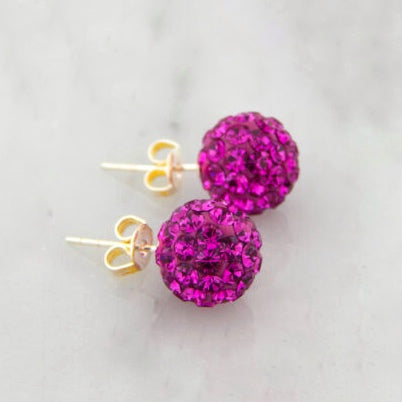 Aretes de acero inoxidable plateado en forma de bola de fuego con cristales fucsia 6mm