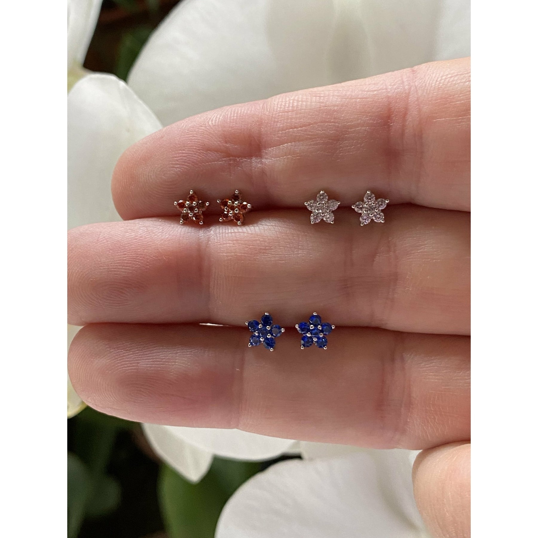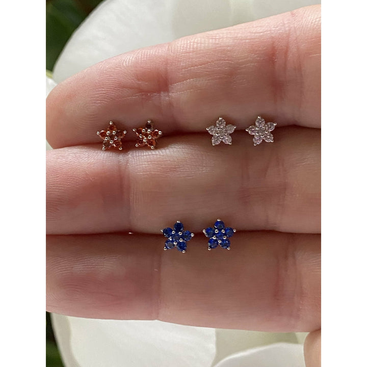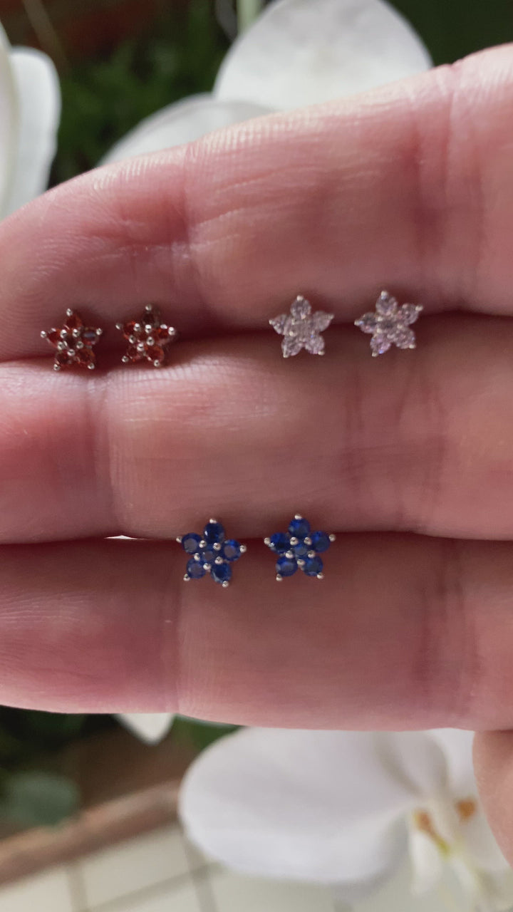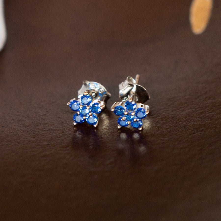 Aretes de plata 925 en forma de flores con zirconias cúbicas azules.