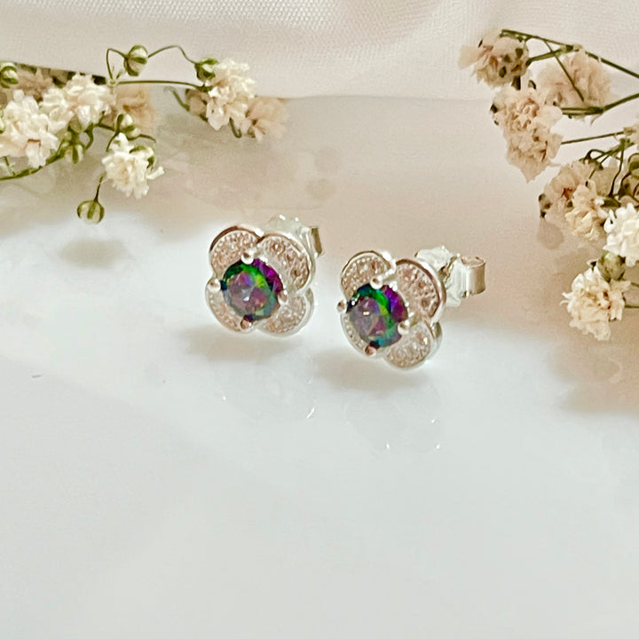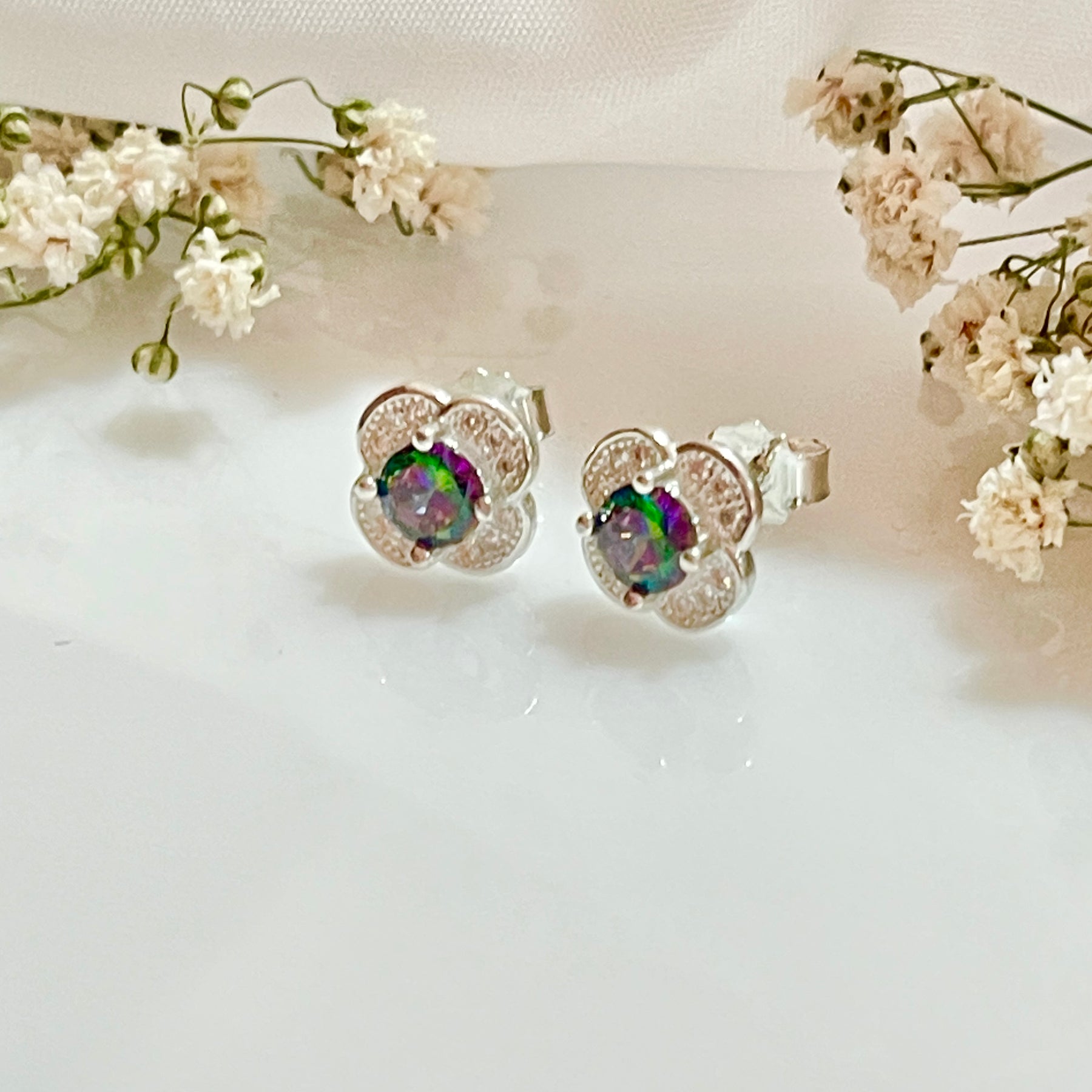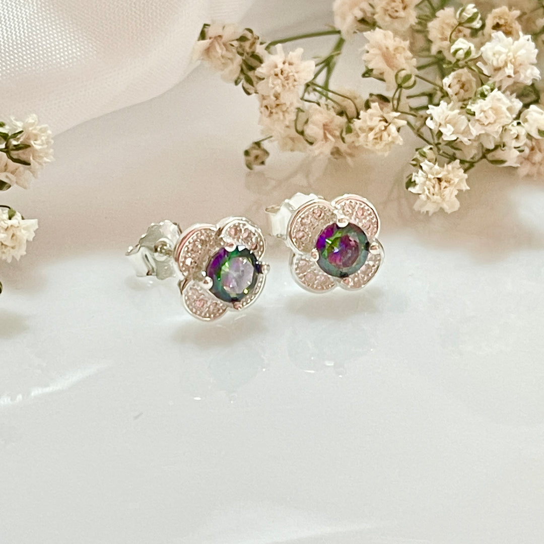 Aretes de Plata Flor Decorada Topacio Místico 7,5MM