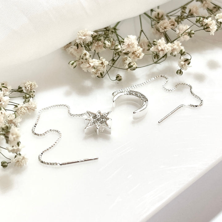 Estos aretes son un excelente accesorio. Fabricados en plata 925, presentan un diseño de estrella y luna adornado con circonitas blancas para darle un toque de brillo.