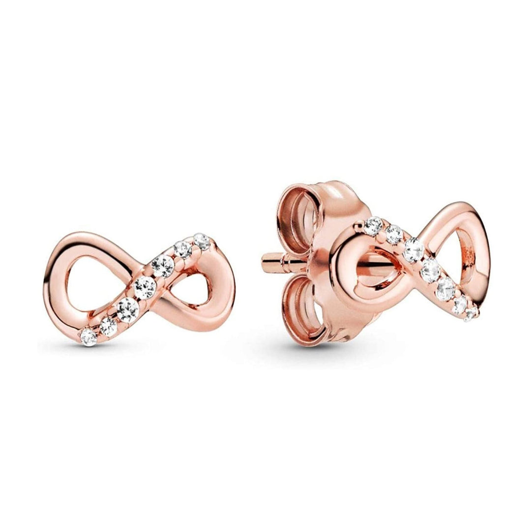 Aretes amor infinito con piedras zirconias cúbicas blancas de plata 925 y baño de oro rosa (garantía de 30 días)