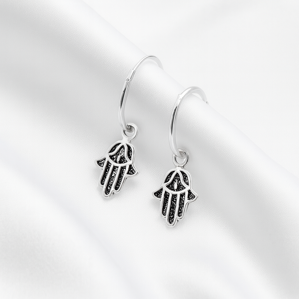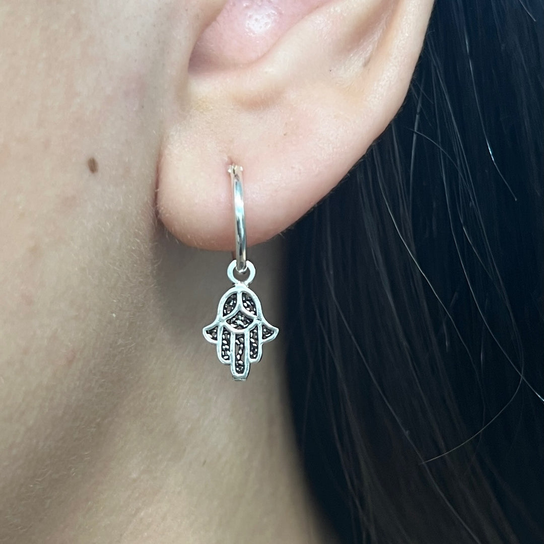 Compra online unas argollas pequeñas de plata con dijes colgantes Mano de Fátima 🪬 Nicola Joyería  ✔️ Envío en 48 horas ✔️ Alta Calidad ✔️ Costa Rica 🇨🇷
