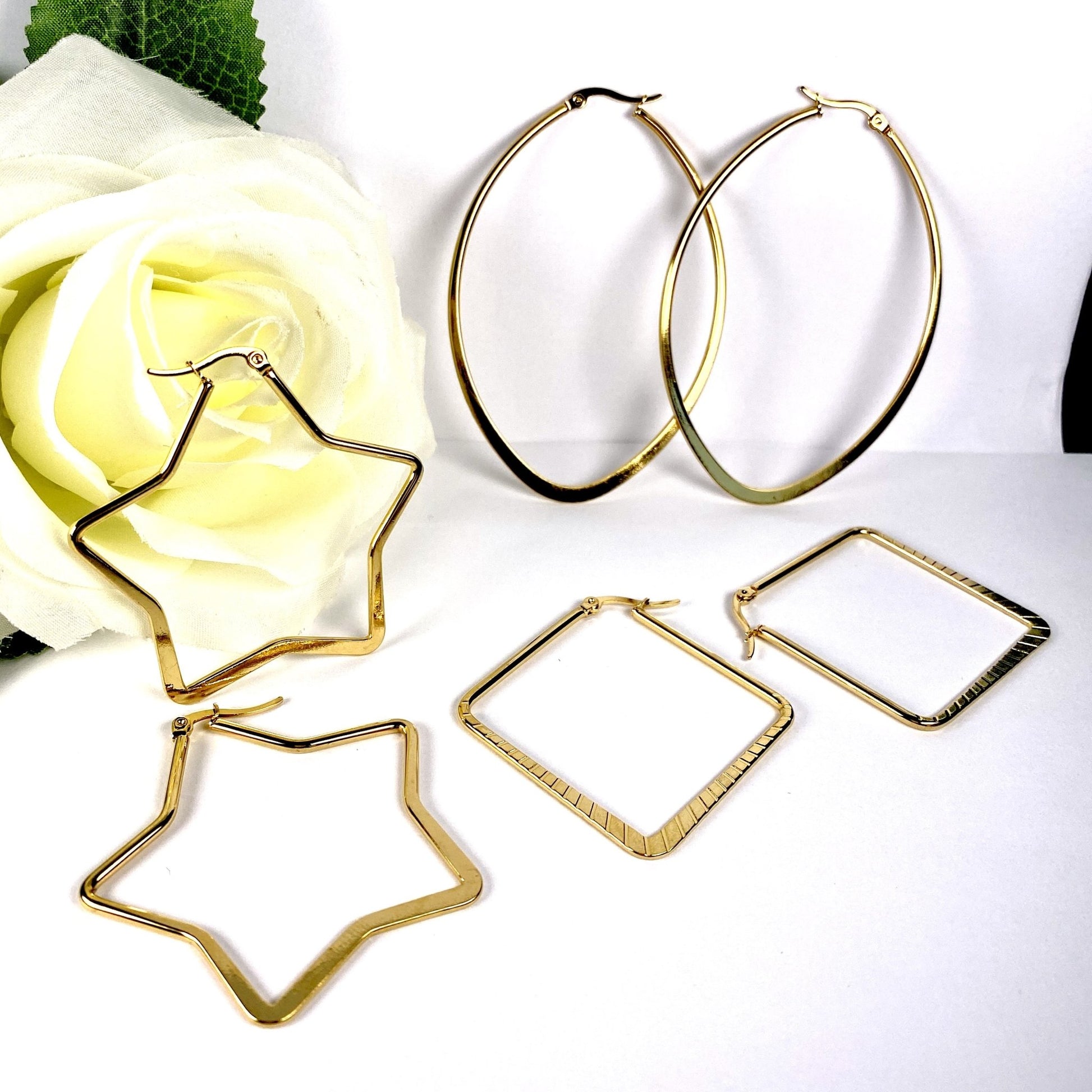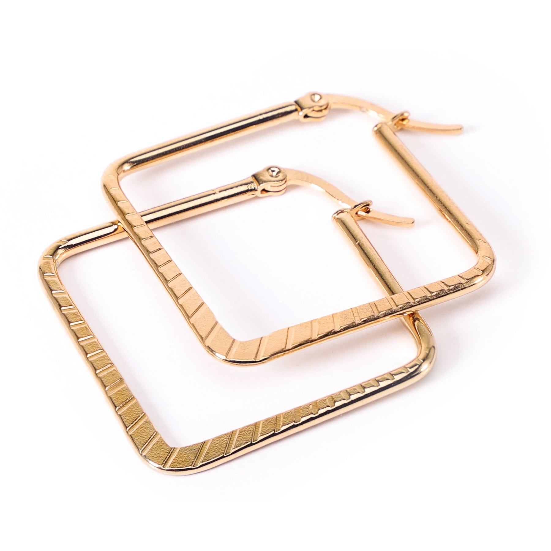 Aretes tipo argollas de acero inoxidable doradas cuadradas con diseño con cierre tipo puente y acabados de alto pulido. Son livianas y súper fáciles de usar.