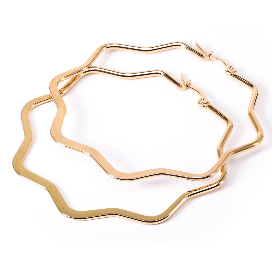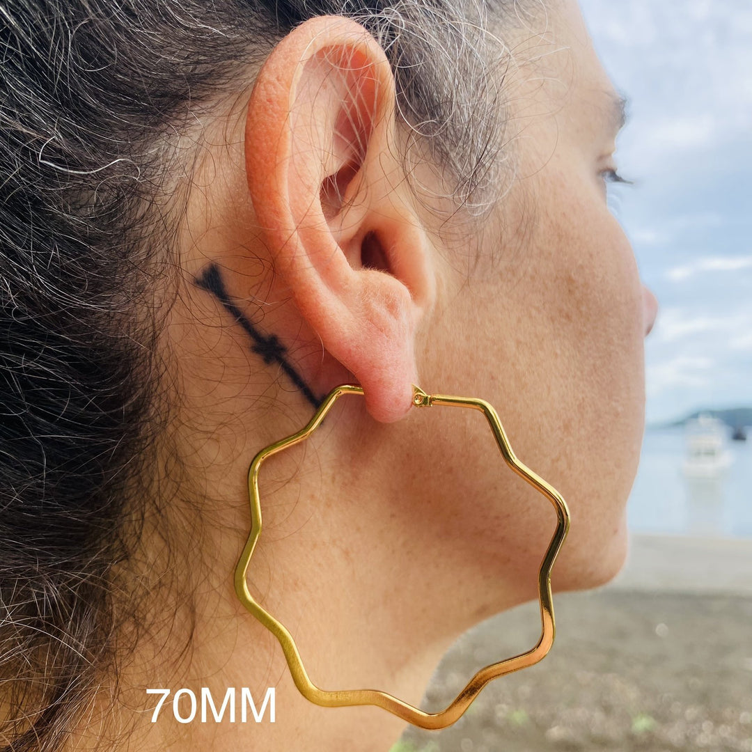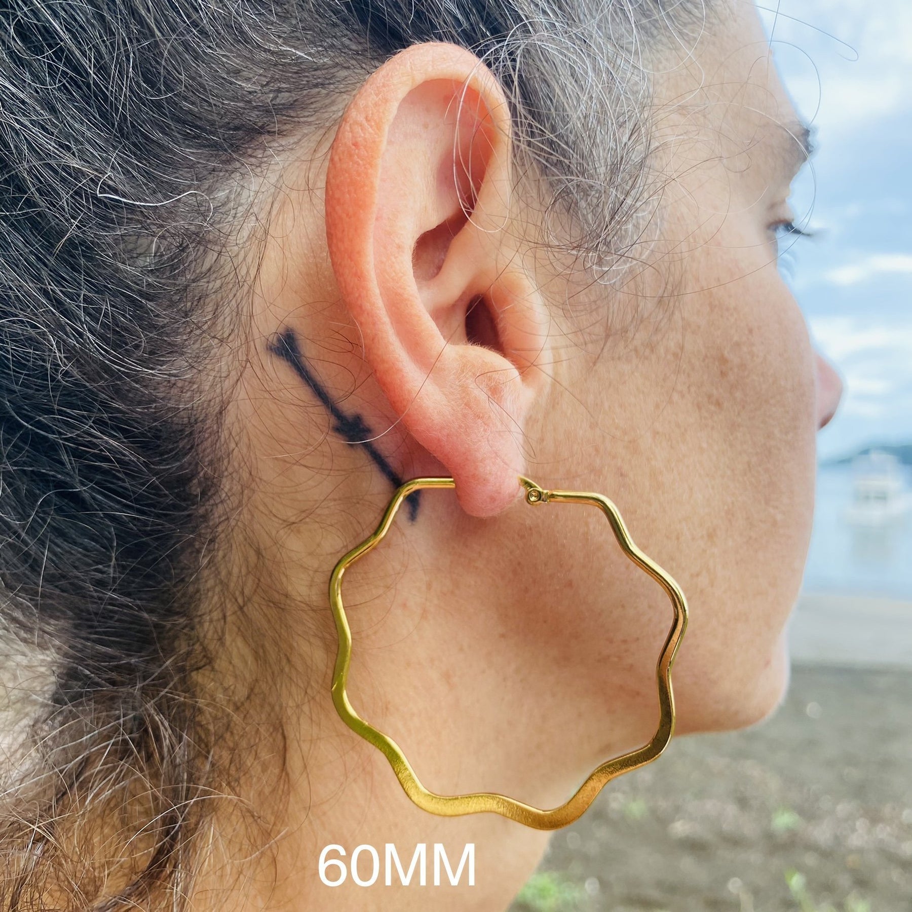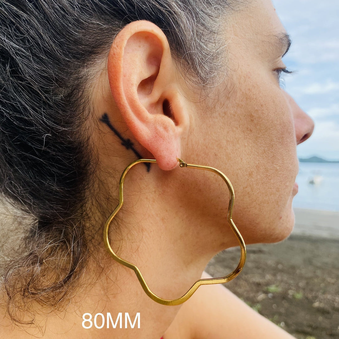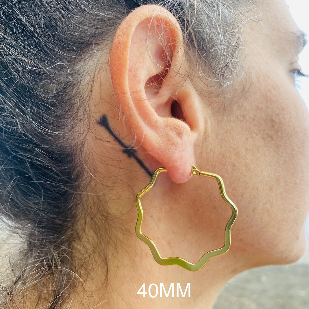Aretes tipo argollas de acero inoxidable doradas en forma de flor con cierre tipo puente.