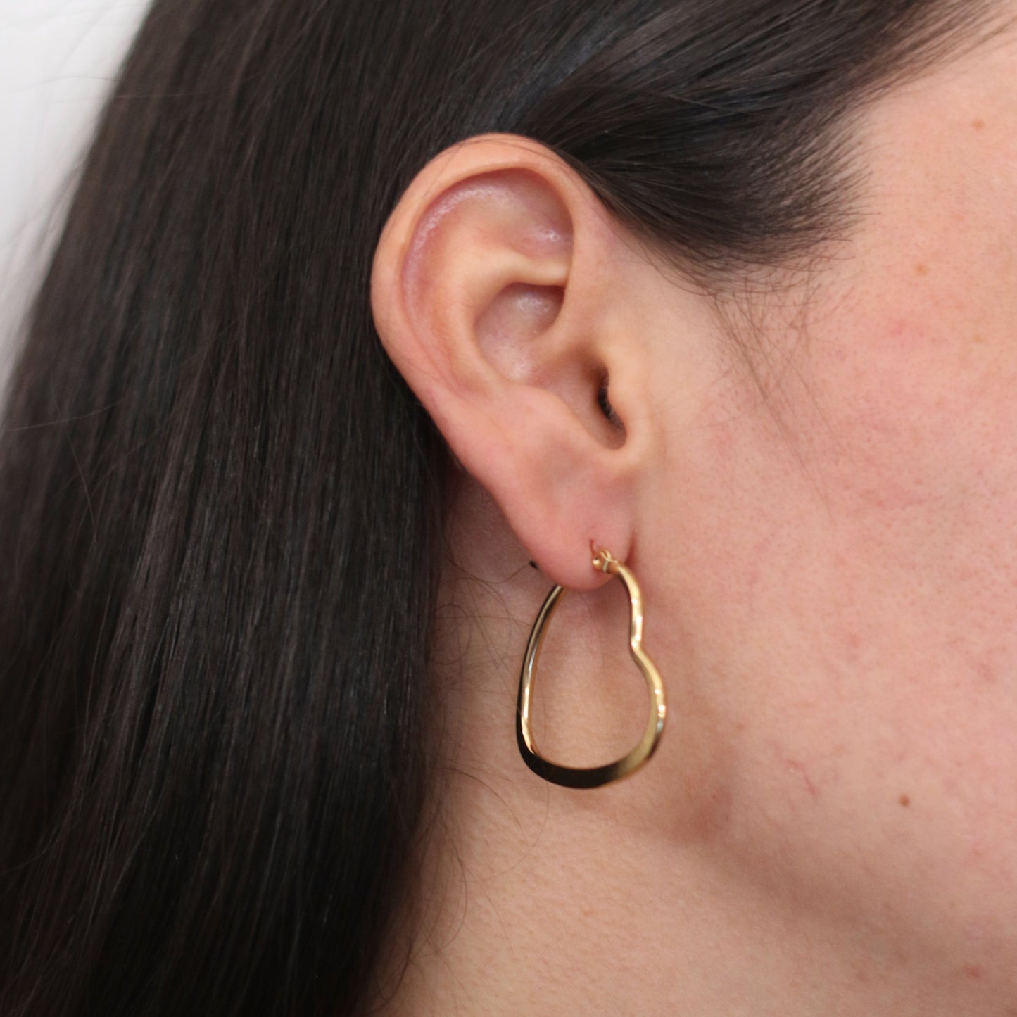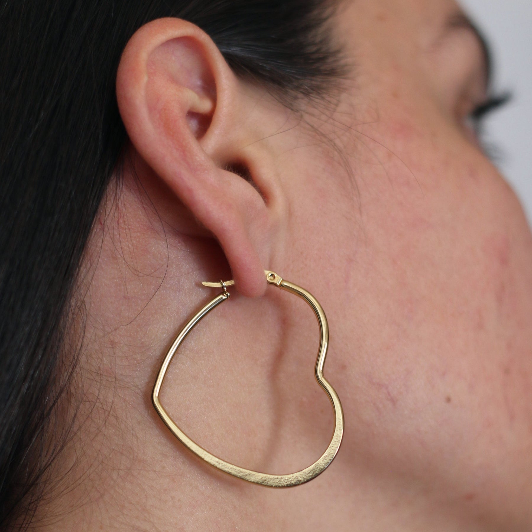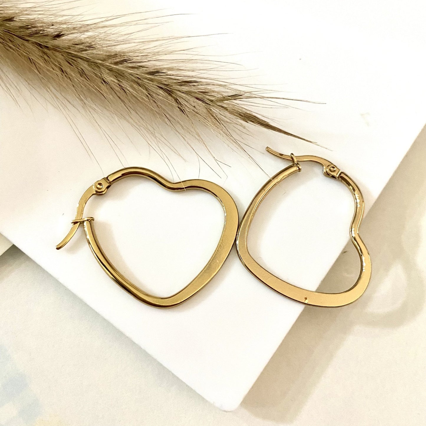 Aretes tipo argollas de acero inoxidable dorado con cierre tipo puente en forma de corazón.