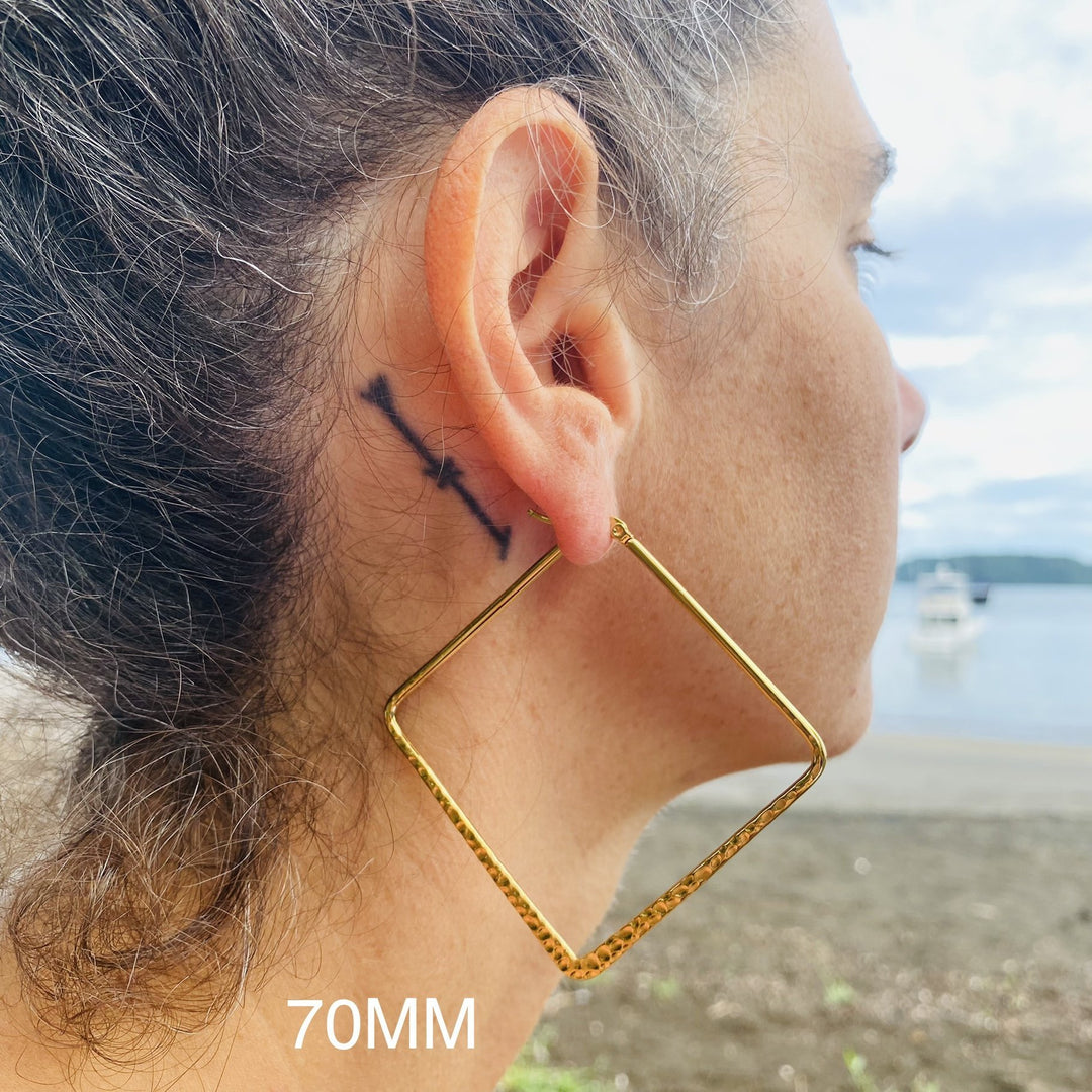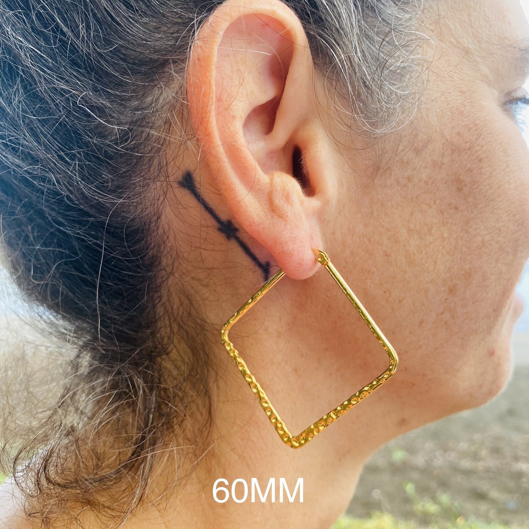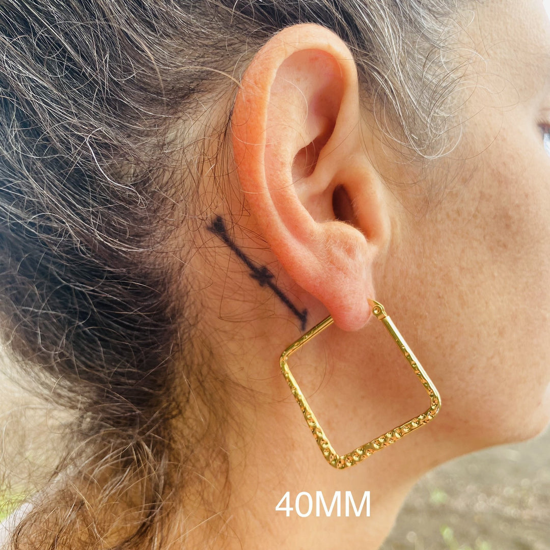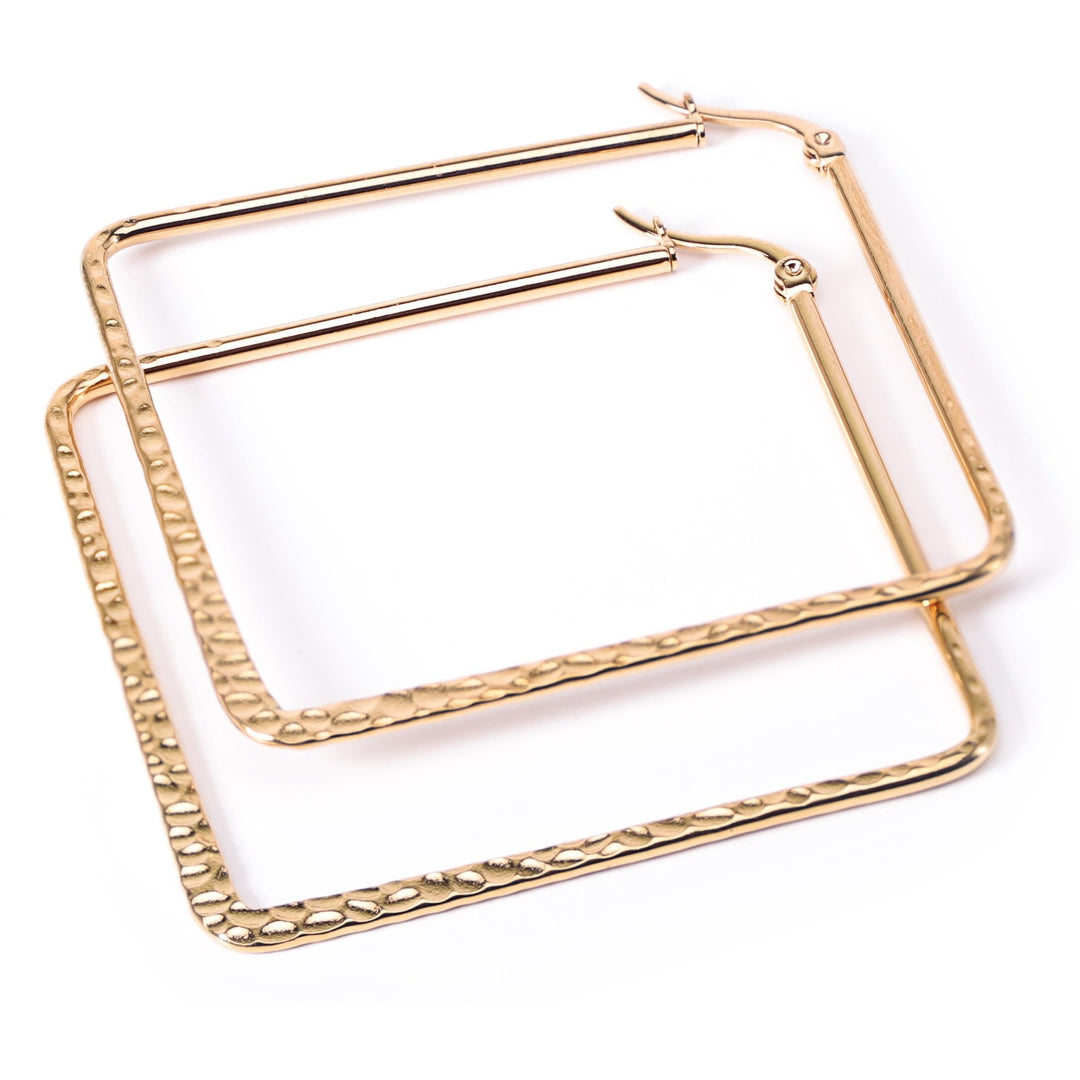 Aretes tipo argollas de acero inoxidable doradas cuadradas con diseño con cierre tipo puente.