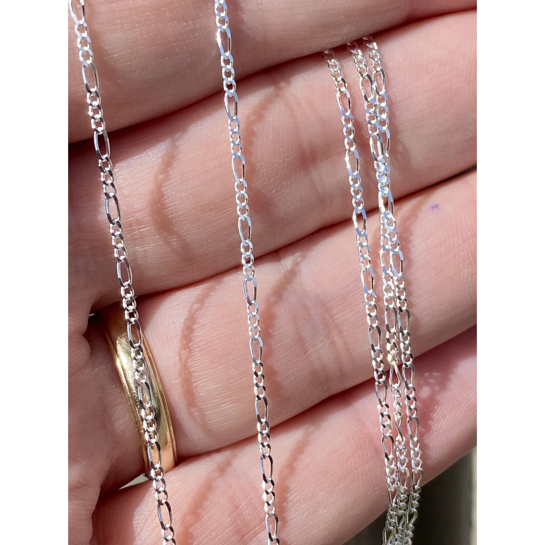 Con un estilo tan atractivo con una sensación elegante, esta impresionante cadena italiana Figaro de plata de ley maciza de 1.5 mm presenta un atractivo patrón de eslabones planos de un solo eslabón rectangular alargado entrelazado con tres eslabones ovalados y realzado por sus elegantes facetas de corte de diamante. Acabado en un acabado de espejo muy pulido. Un estilo fantástico que se puede usar como una pieza de todos los días, ya sea simplemente por sí solo o complementado con un dije de su elección.