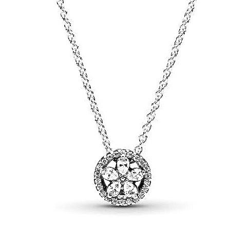 El collar presenta piedras transparentes en forma de copo de nieve en forma de estrella dentro de un círculo decorado con zirconia transparente.