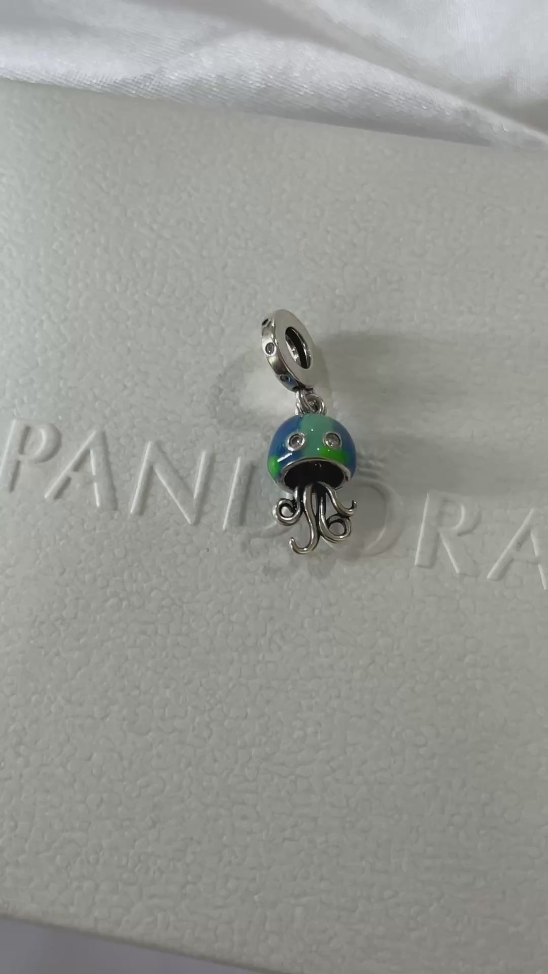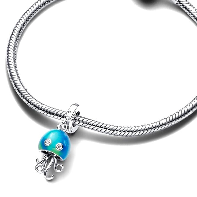 Canaliza la sabiduría de los océanos con el Charm Colgante Medusa que Cambia de Color. Este charm en plata de primera ley acabado a mano se presenta con tentáculos móviles en plata de primera ley, circonitas cúbicas transparentes adornando los ojos y esmalte especial en tonos de azul que cambian de color a altas o bajas temperaturas. En la naturaleza, la medusa se deja llevar y siempre avanzan, así que agrégalo a tu estilo de charms favorito como recordatorio de aceptar el cambio y confiar en tu yo interior.