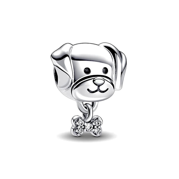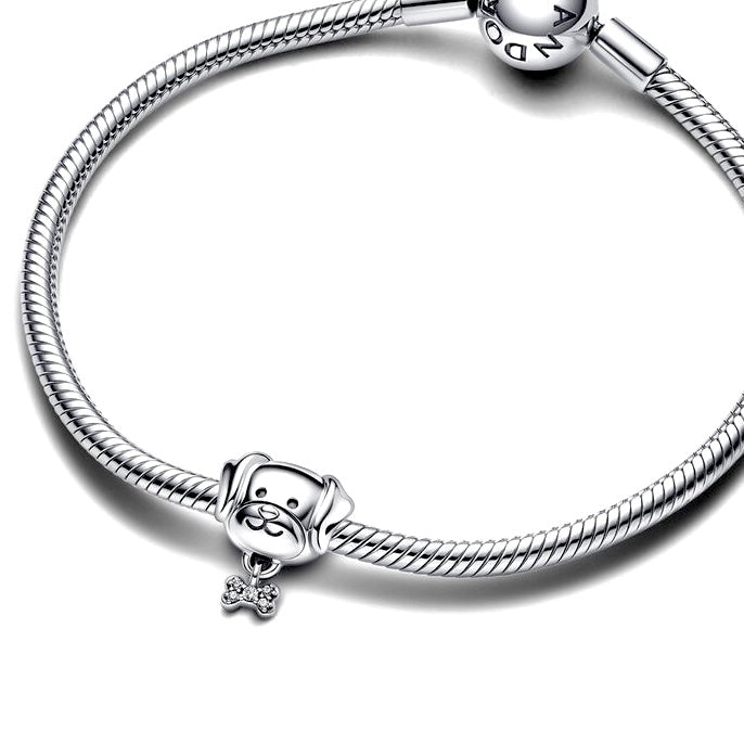 Haz brillar el amor que sientes por tu mascota de 4 patas con el Charm Mascota Perro y Hueso. Acabado a mano en plata de primera ley, esta joya retro, con un toque moderno, está decorada con líneas grabadas en la cara y brillante pavé en el colgante del hueso. Llévalo en tu pulsera para mostrar el lugar especial que ocupa tu mascota en tu corazón.