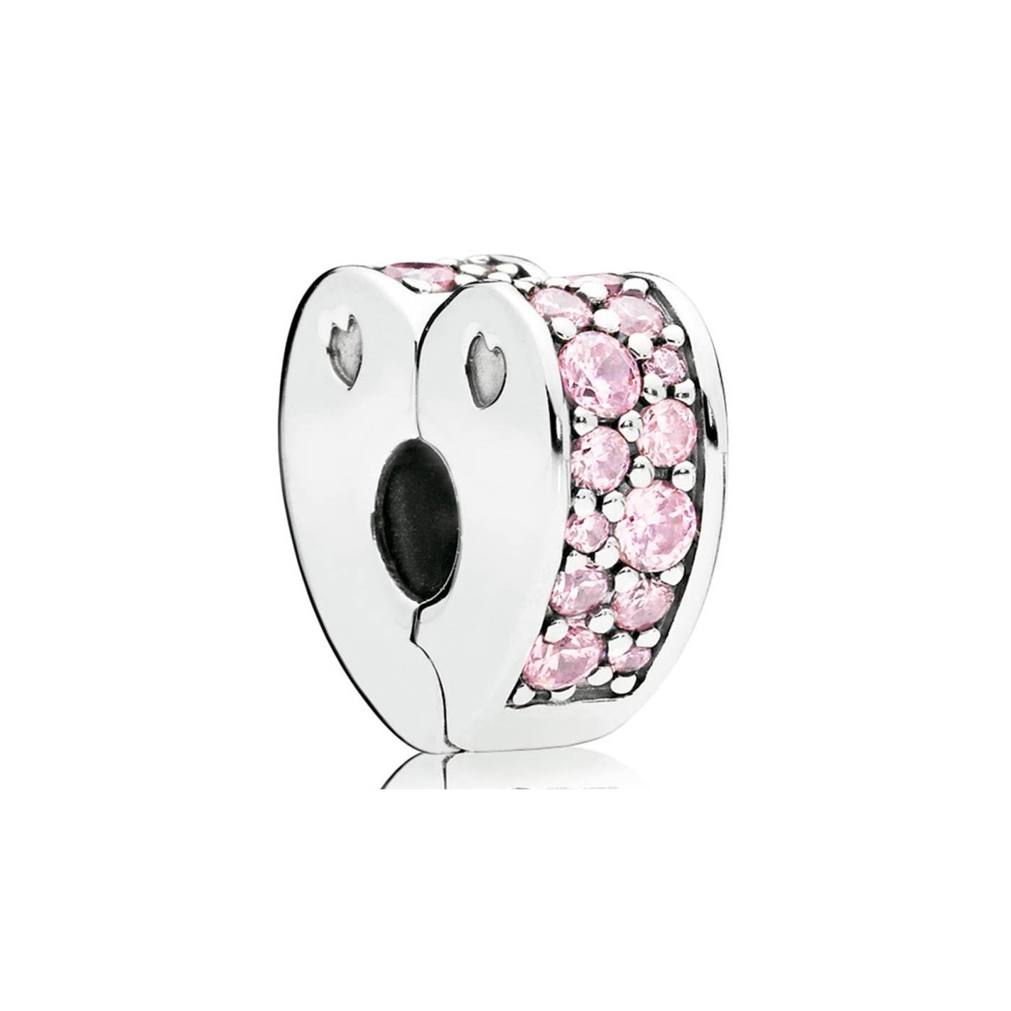 Clip charm en Plata de Ley en forma de corazón, con pierdas en diferentes todos de rosa. Este clip sin duda dará un toque de color a tu pulsera haciendo tope entre todos tu charms. Compatible con Pandora y otras marcas. Perfecta para uso diario.