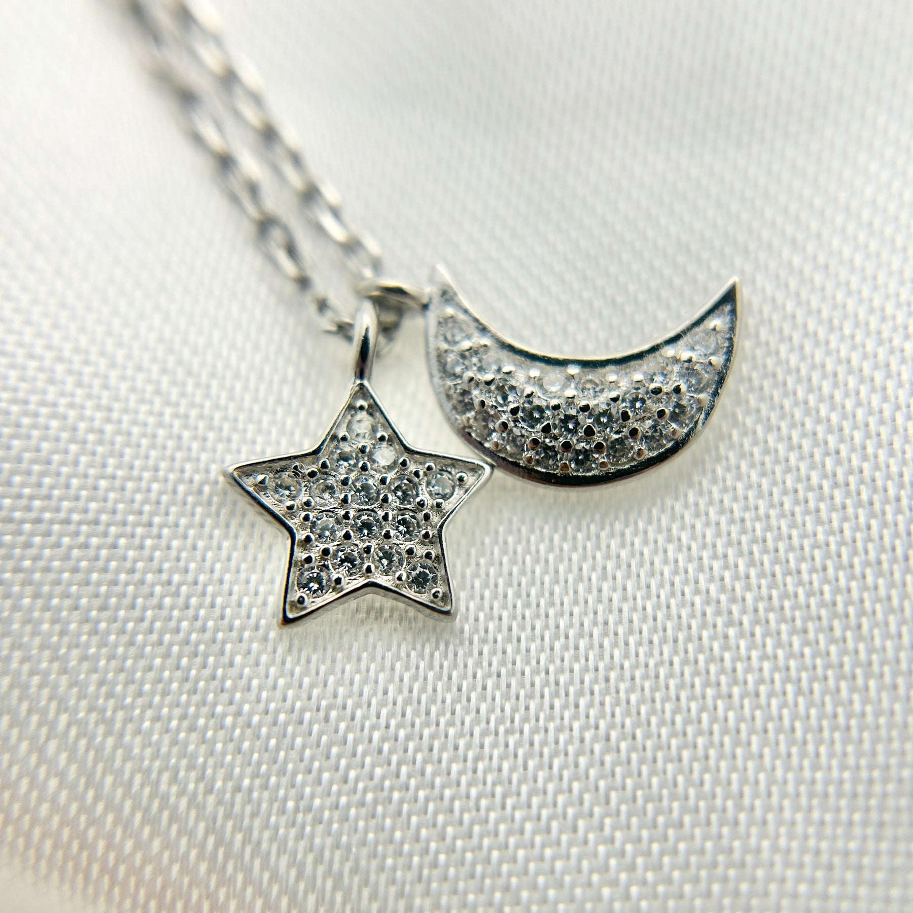 Esta elegante pieza se convertirá en un básico en la colección de joyas de cualquier mujer. Incluye dos cadenas delicadamente elaboradas: una con un dije de luna de 7 mm y 45 cm de largo, y otra de 40 cm con un dije de estrella de 5 mm.