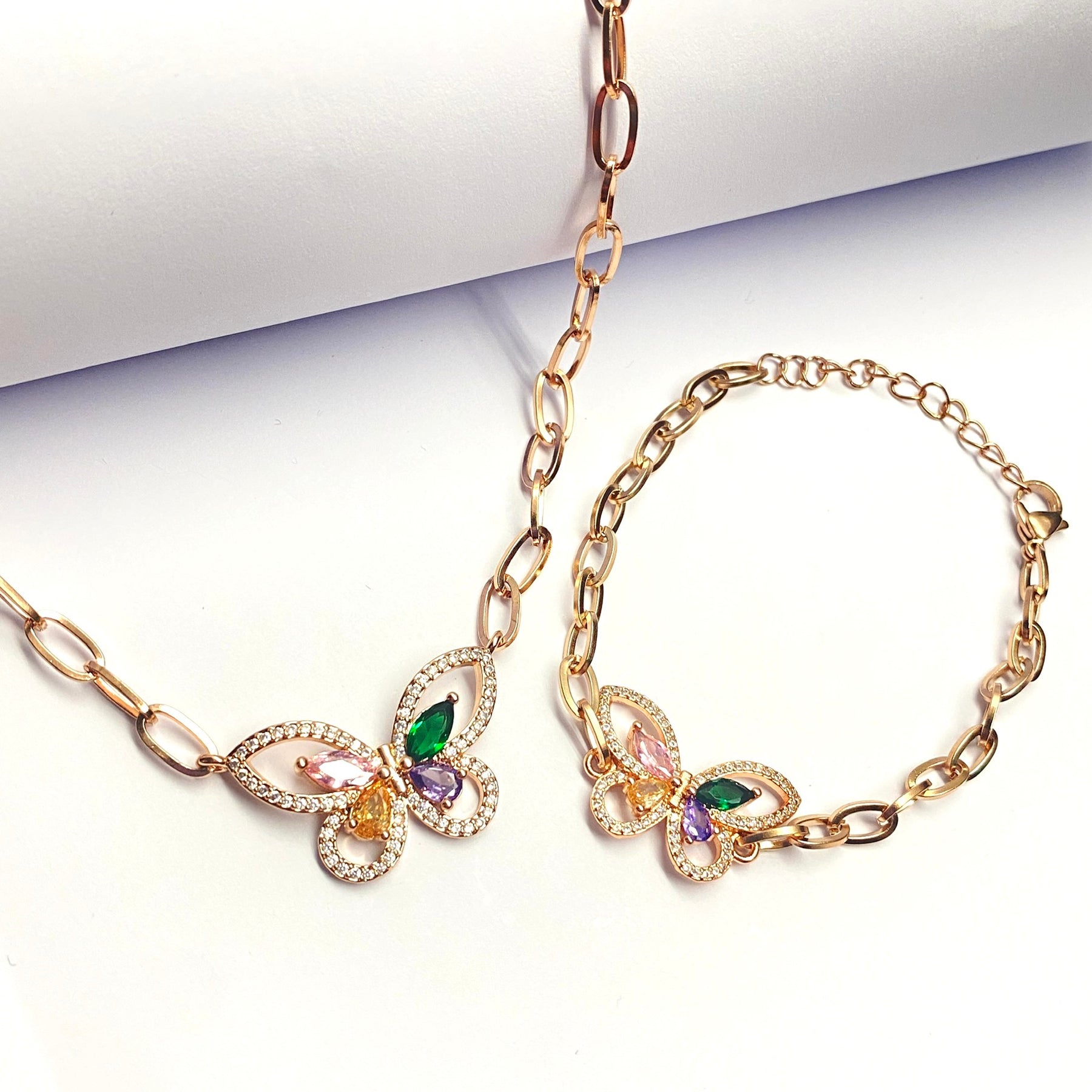 Esta elegante gargantilla de acero inoxidable con dije  de mariposa es un accesorio imprescindible para cualquier mujer amante de la moda. La cadena de 40 cm+ 5cm de extensión es perfecta para combinarla con otros collares o para llevarla sola como pieza estrella. La pulsera es el toque final perfecto para este hermoso conjunto.