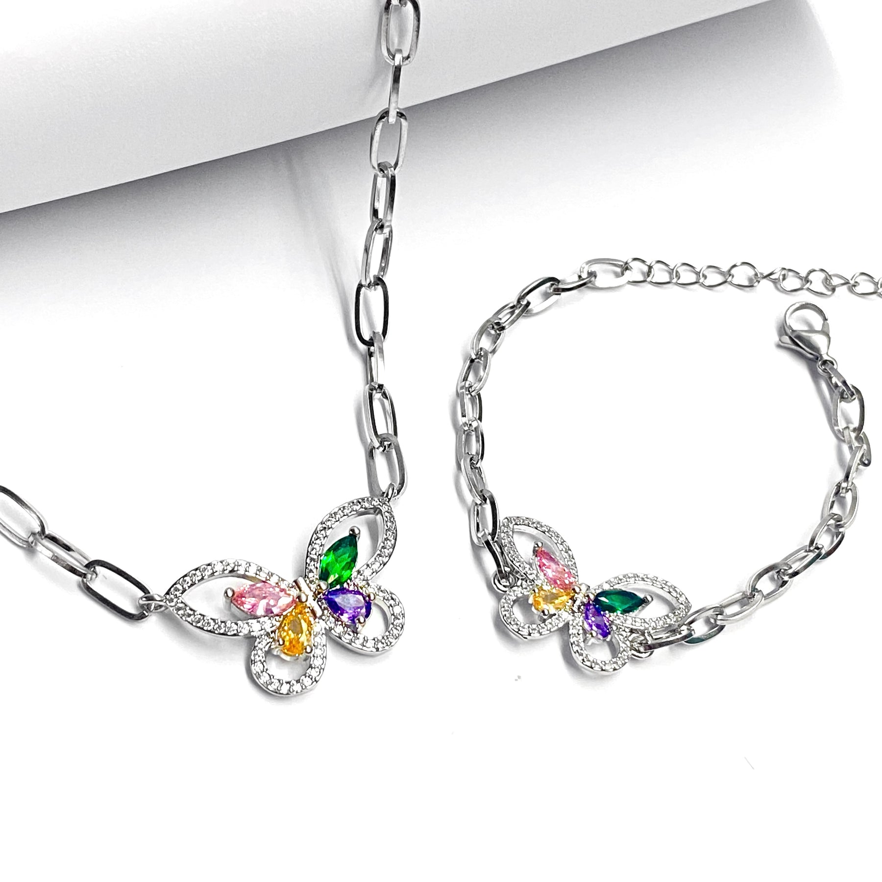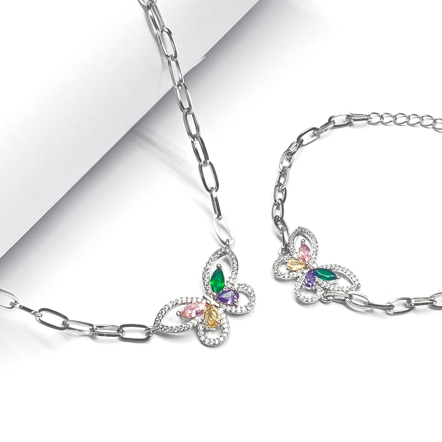 Esta elegante gargantilla de acero inoxidable con dije  de mariposa es un accesorio imprescindible para cualquier mujer amante de la moda. La cadena de 40 cm+ 5cm de extensión es perfecta para combinarla con otros collares o para llevarla sola como pieza estrella. La pulsera es el toque final perfecto para este hermoso conjunto.