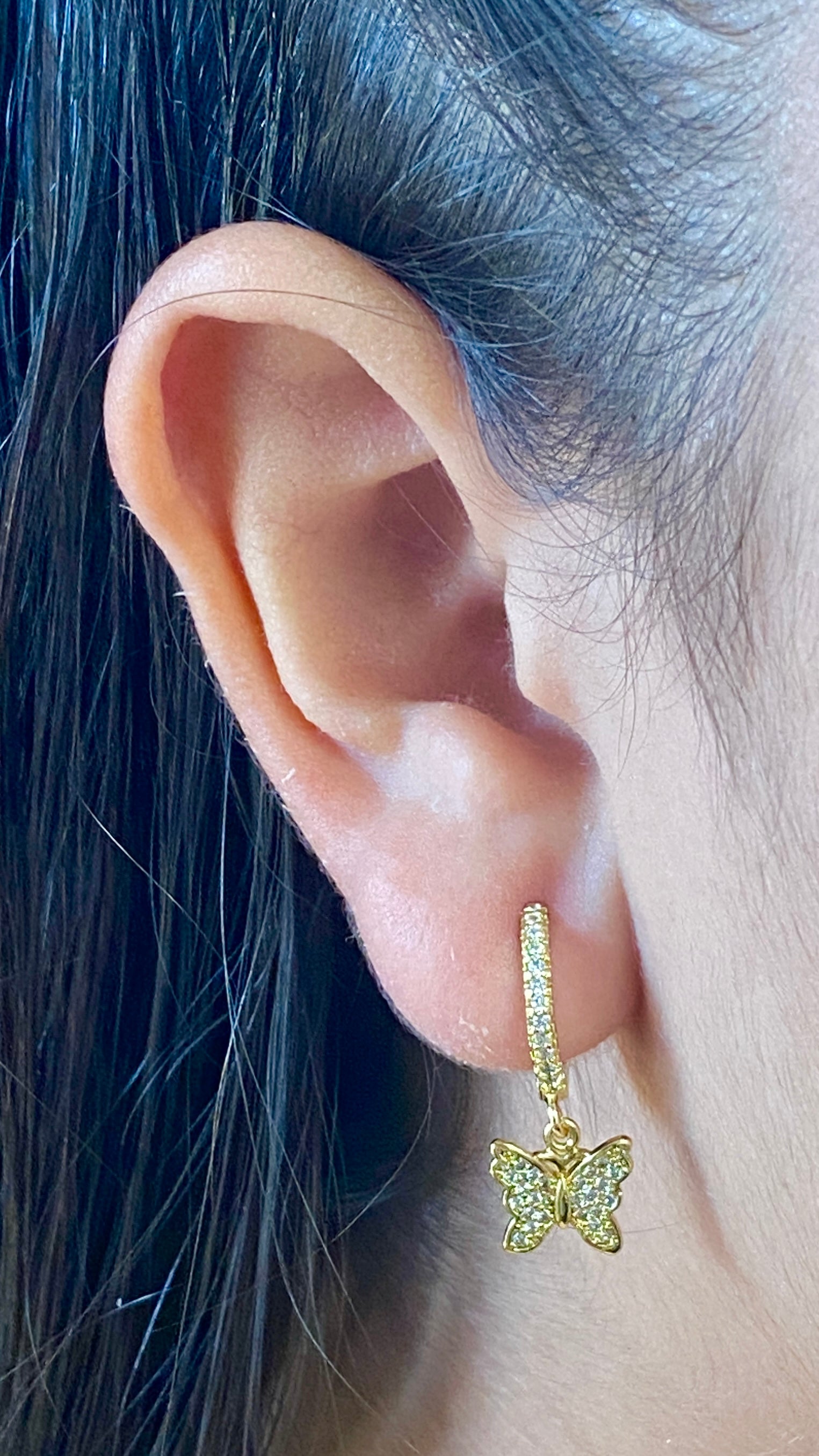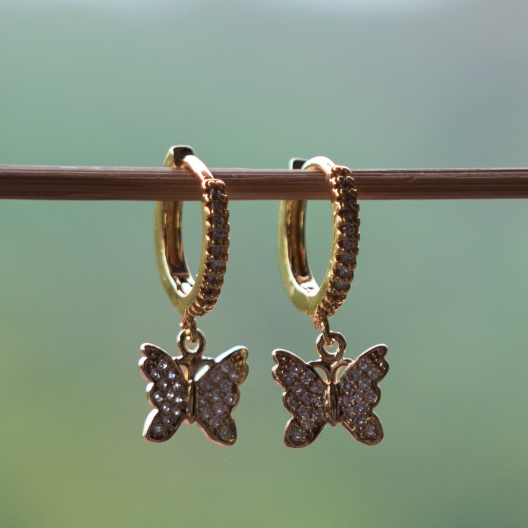 ¡Presentamos nuestros huggies colgantes de mariposas! Estos aretes están hechos con una aleación de metal chapado en oro de 14k y están rellenos de brillantes circonitas blancas. Además, son ligeros y cómodos de llevar, por lo que podrá disfrutar de ellos durante todo el día.