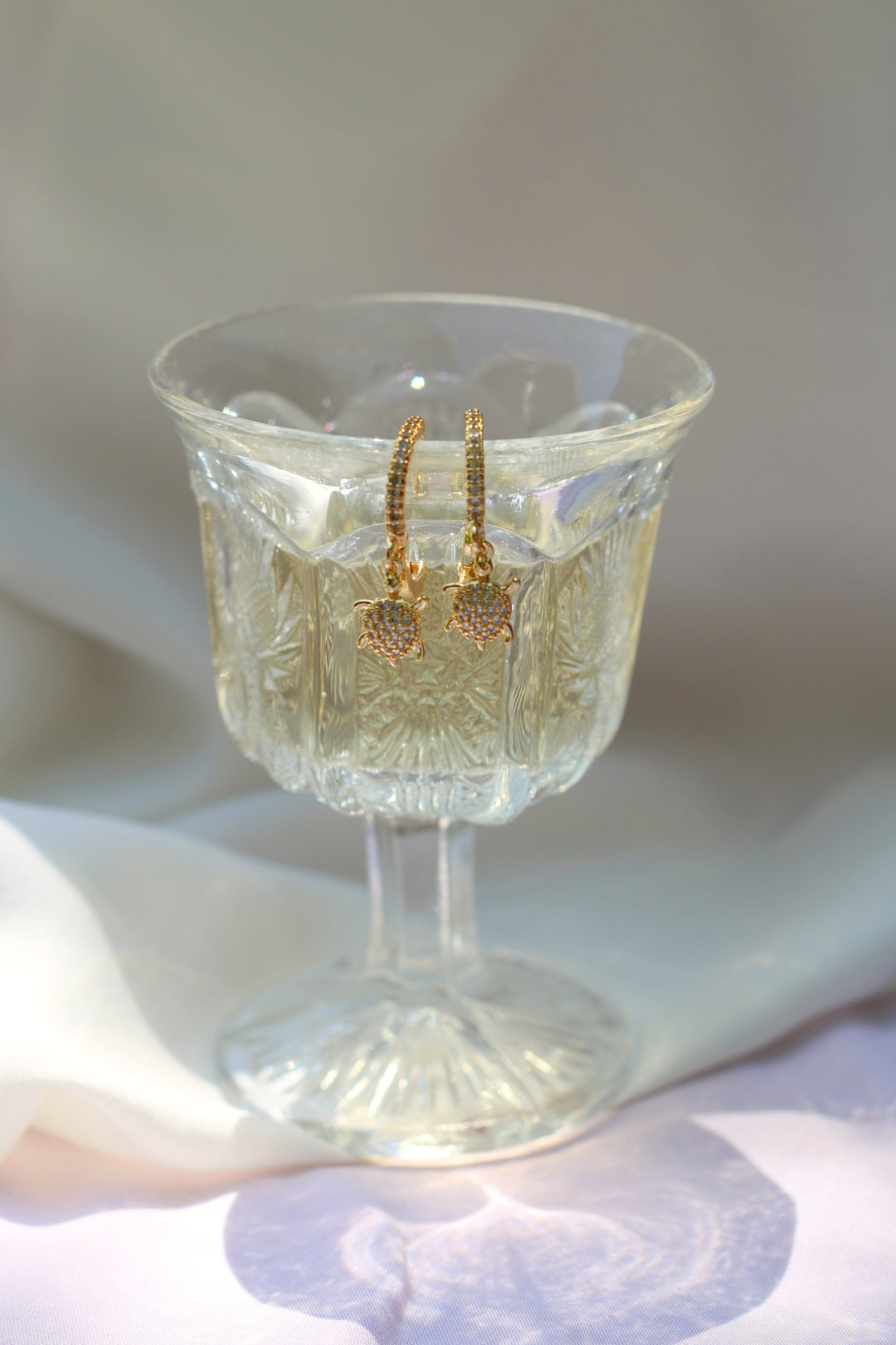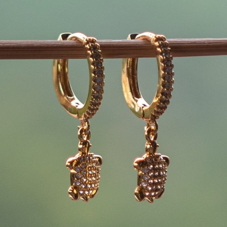 Añada un toque de fantasía a su estilo con estos deliciosos pendientes de tortuga dorados. Fabricados con una aleación de metales chapados en oro de 14k, cada arete presenta una pequeña tortuga con incrustaciones de brillantes circonitas blancas. La tortuga es un símbolo de paz y serenidad, por lo que estos pendientes son el accesorio perfecto para cualquier conjunto. Tanto si te vistes para una ocasión especial como si simplemente añades un toque extra a tu look diario, estos aretes seguro que causan sensación.