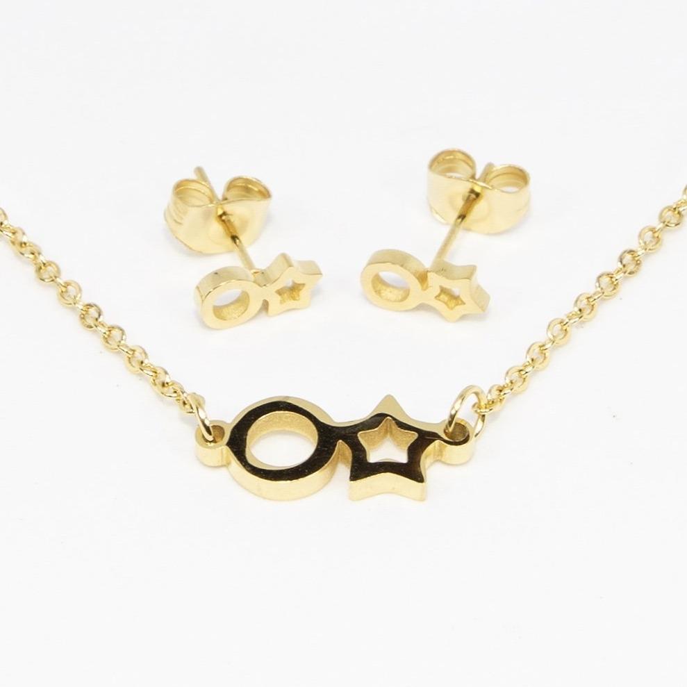 Aretes, dije y cadena de acero inoxidable dorado en forma de circulo y estrella.