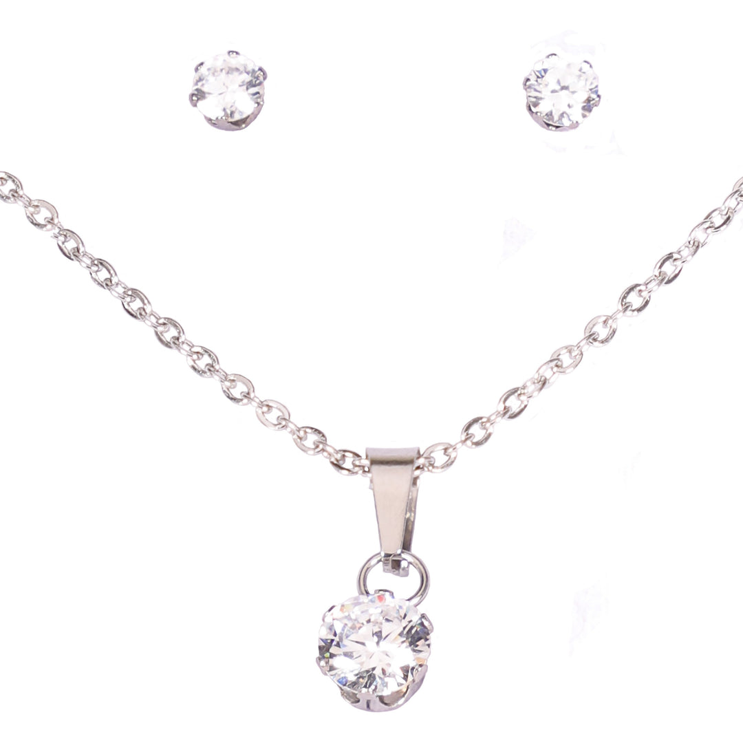 Aretes, dije y cadena de acero inoxidable plateado con circonias blancas redondas.