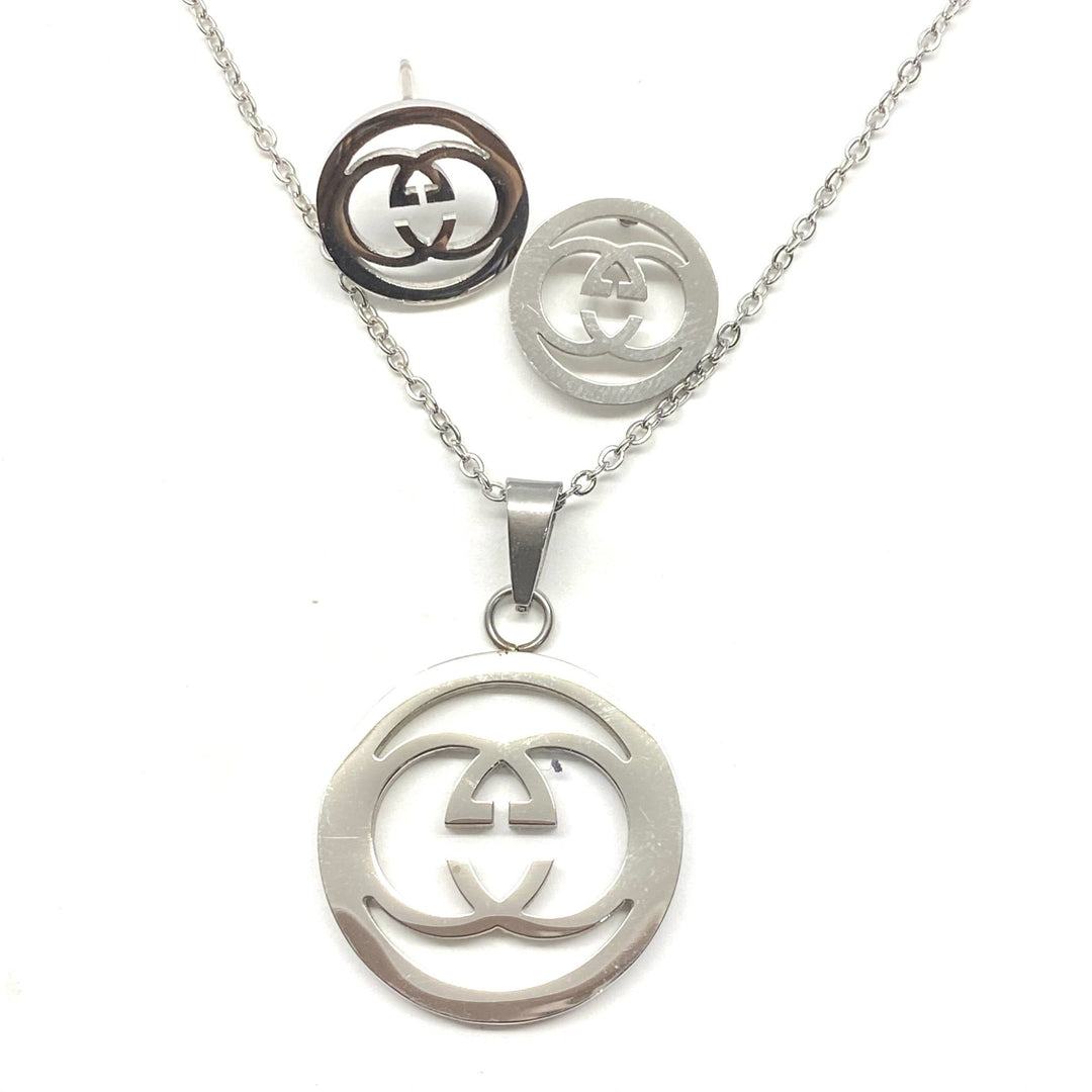 Aretes, dije y cadena de acero Inoxidable plateado Gucci