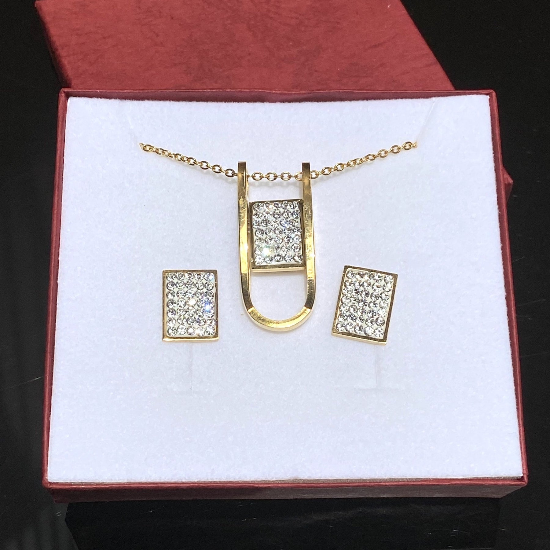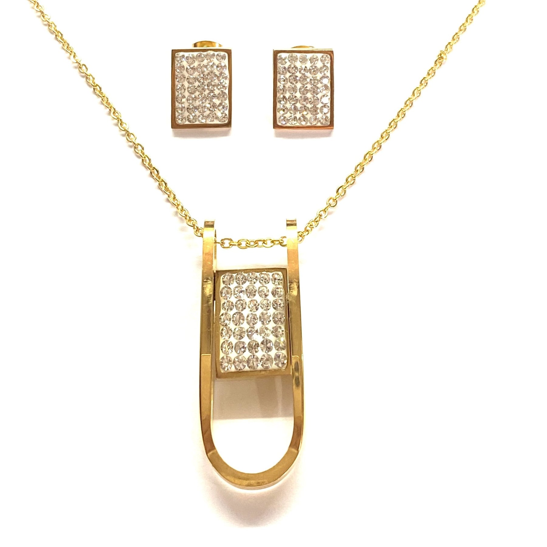 Juego de aretes, dije y cadena de acero inoxidable dorado.