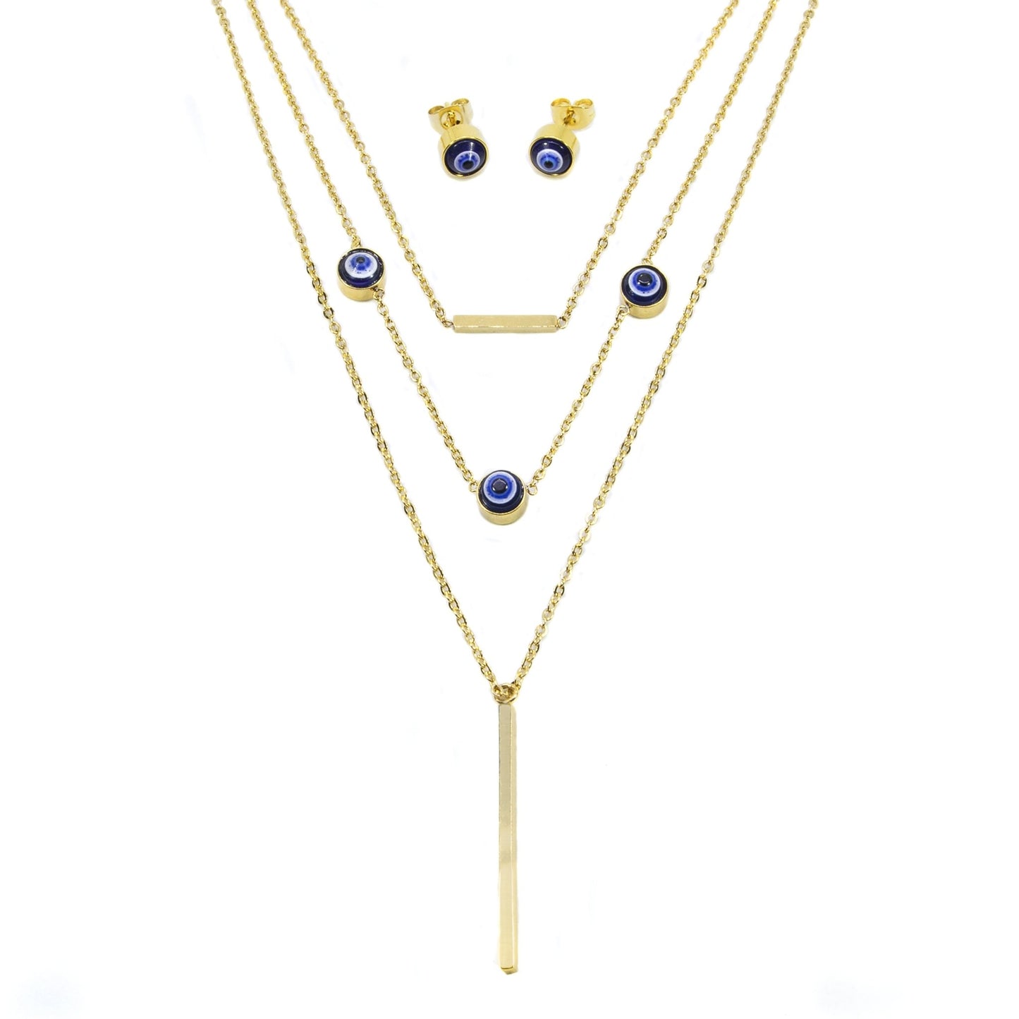 Aretes, dije y cadena de acero inoxidable dorado con ojo turco.