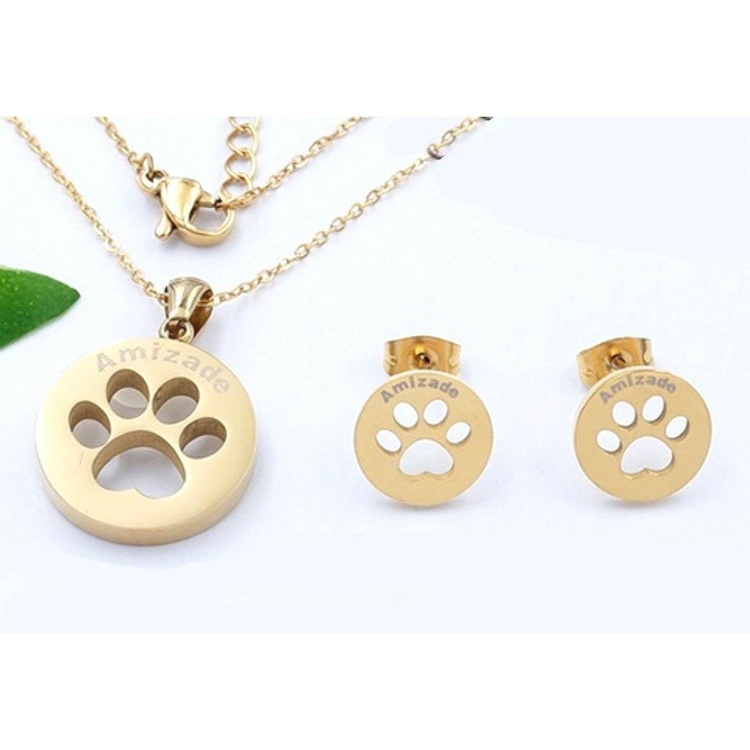 Juego de acero inoxidable dorado con dije de pata de parro.