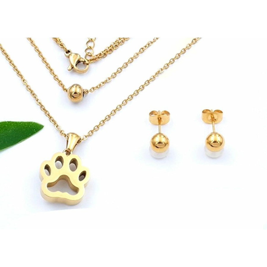 Juego de acero inoxidable dorado con dije de pata de perrito.