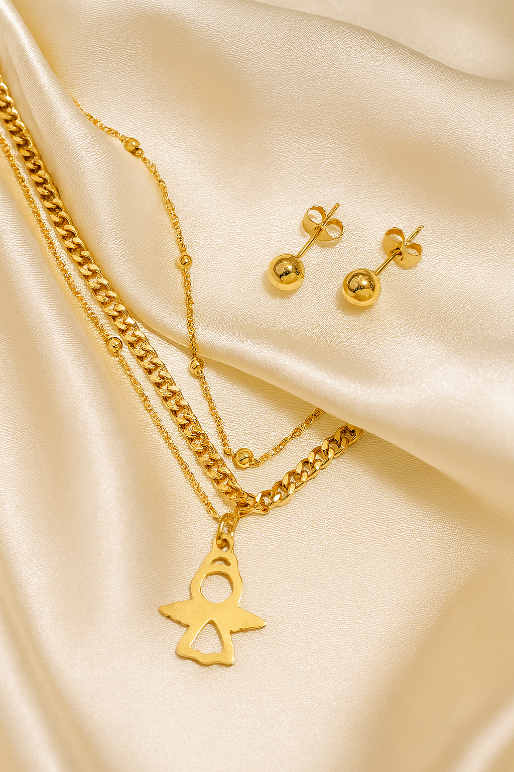 Juego de acero inoxidable dorado con dije de ángel.