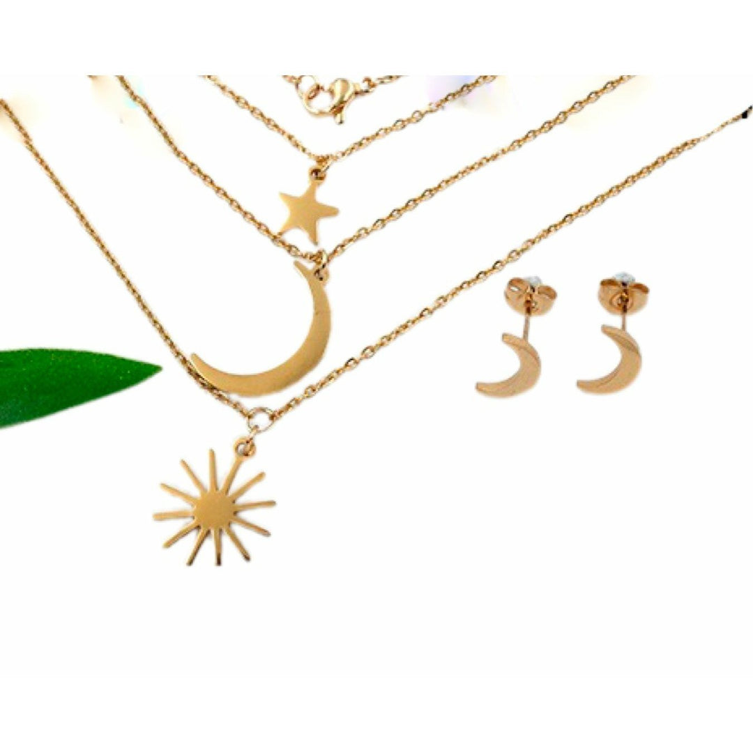 Juego de acero inoxidable dorado con dije de lunas y sol.