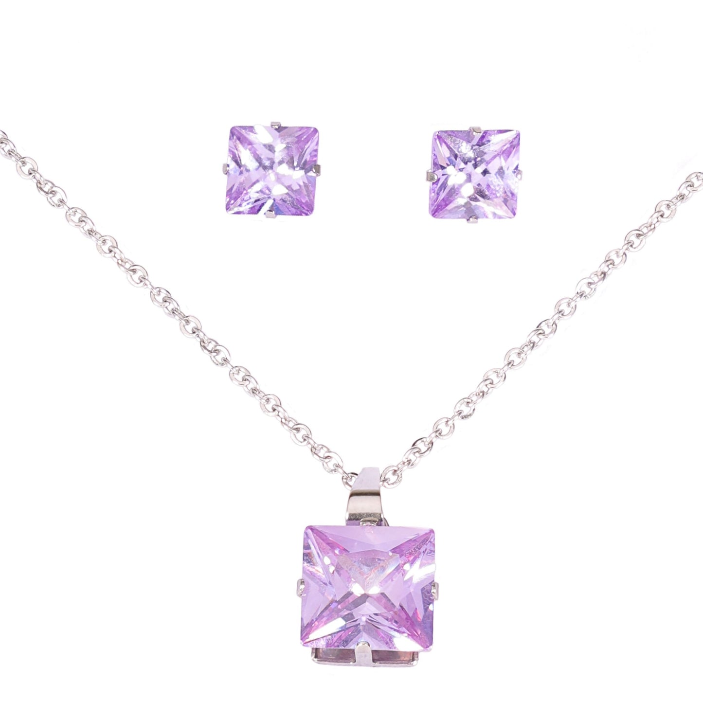 Aretes, dije y cadena de acero inoxidable plateadas con circonias moradas cuadradas