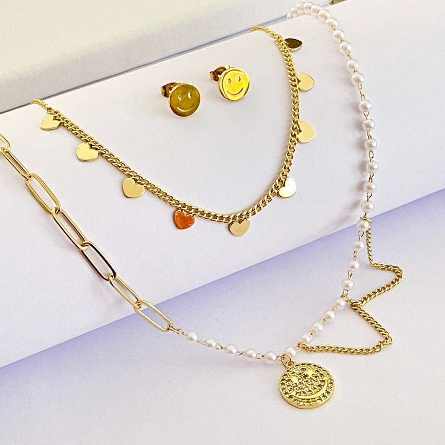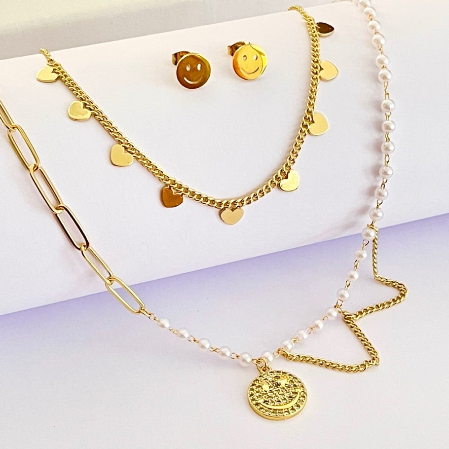 Juego de acero inoxidable dorado doble con caritas felices. Incluye aretes.