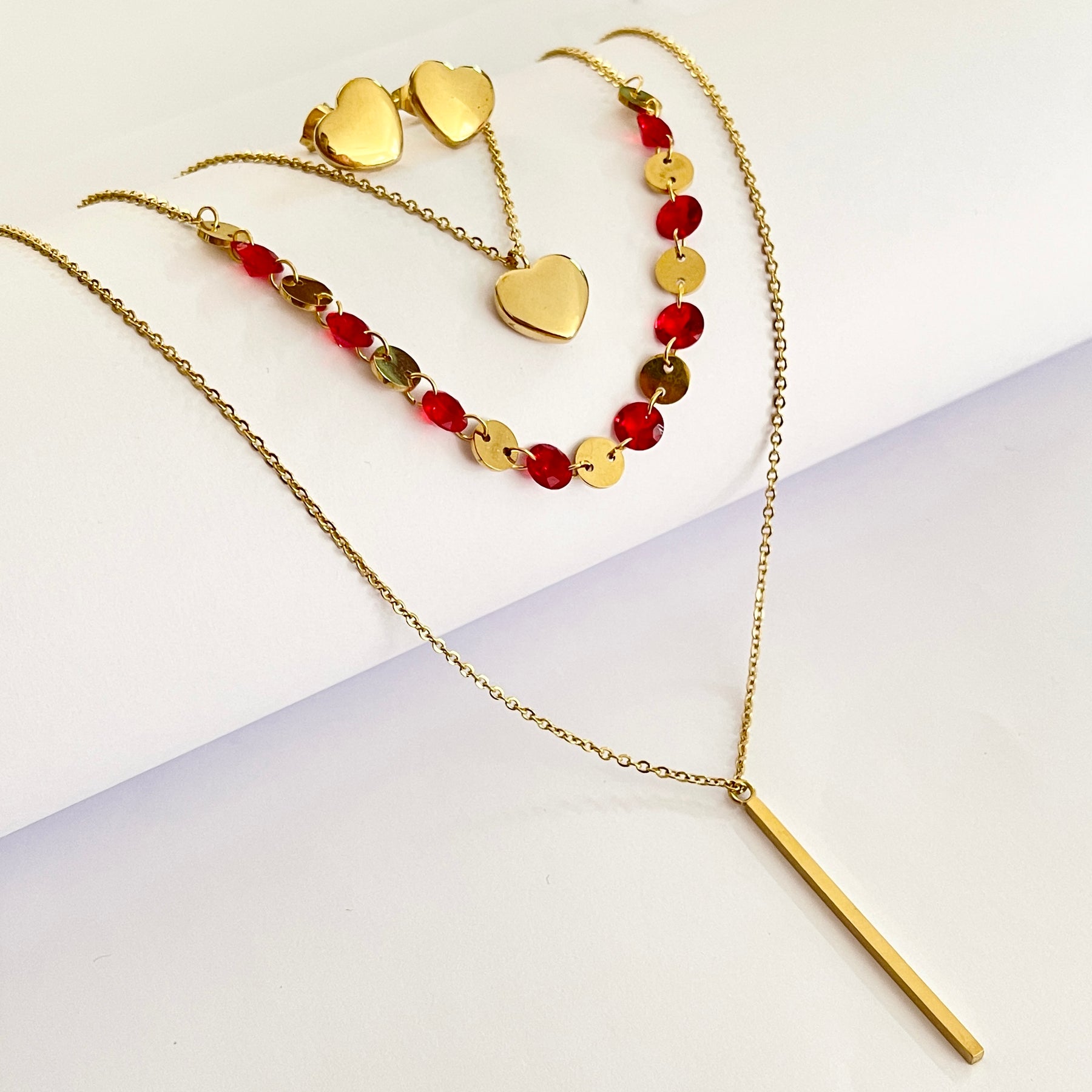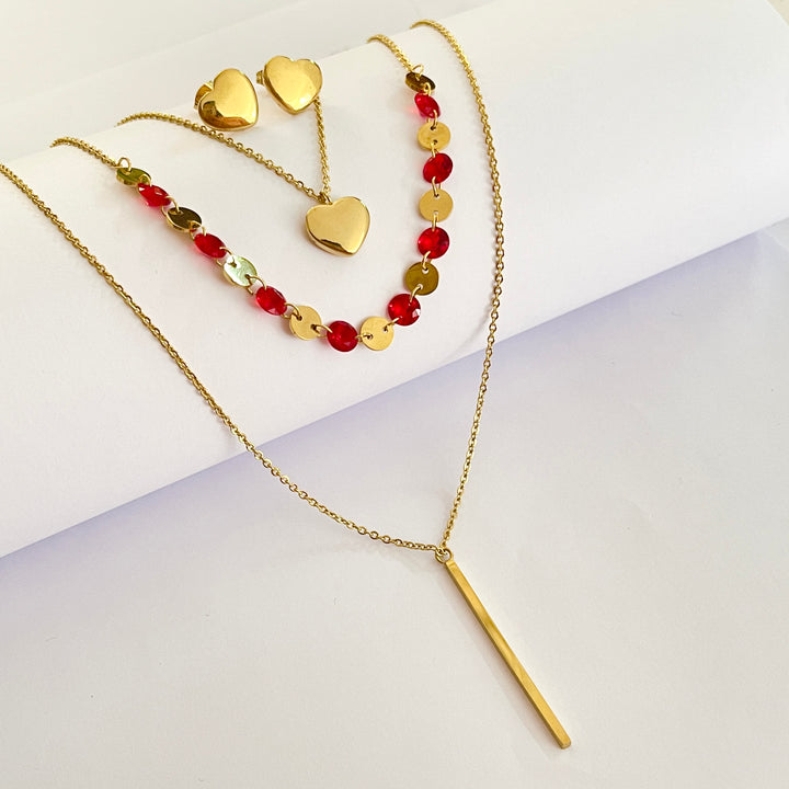 Juego de acero inoxidable dorado triple con aretes.