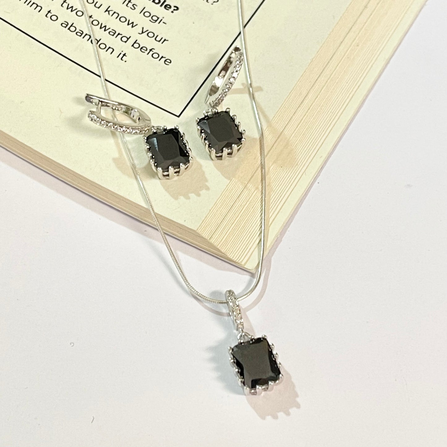 Aretes y dije de plata 925 rodinada con piedras zirconias cúbicas negras.