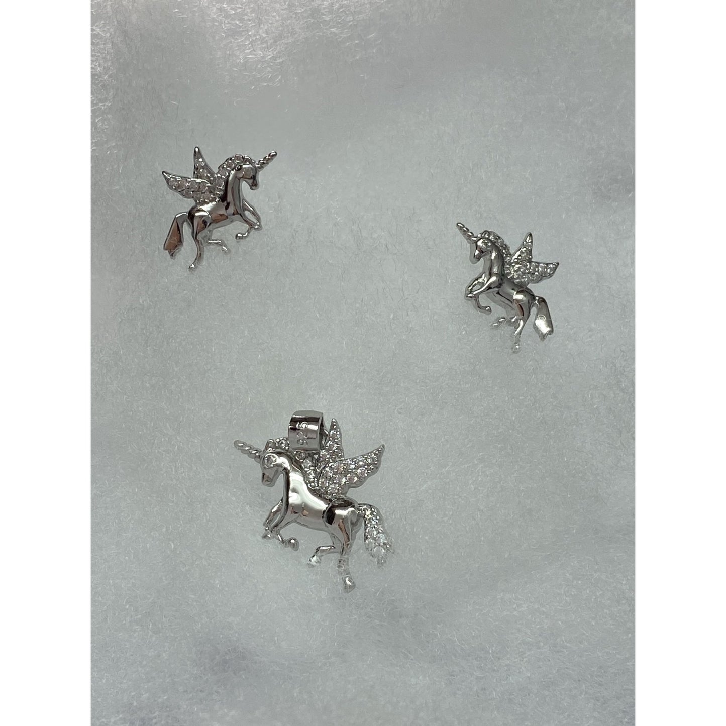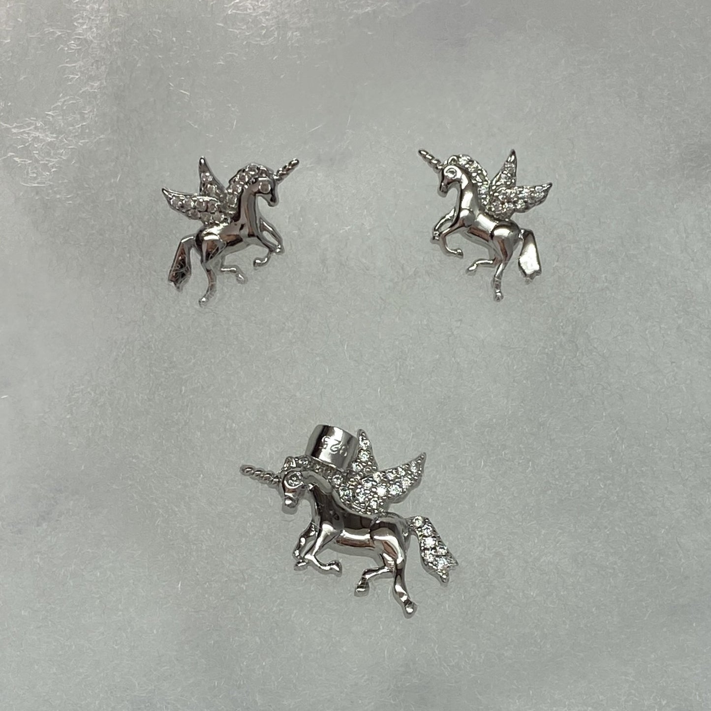 Aretes 12MM  y dije 22MM en forma de unicornios de plata 925 rodinada con piedras zirconias cúbicas blancas y azules.