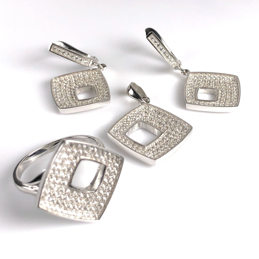 Aretes, dije y anillo de plata esterlina en forma cuadrada con piedras circonias tipo pave con baño de rodio.