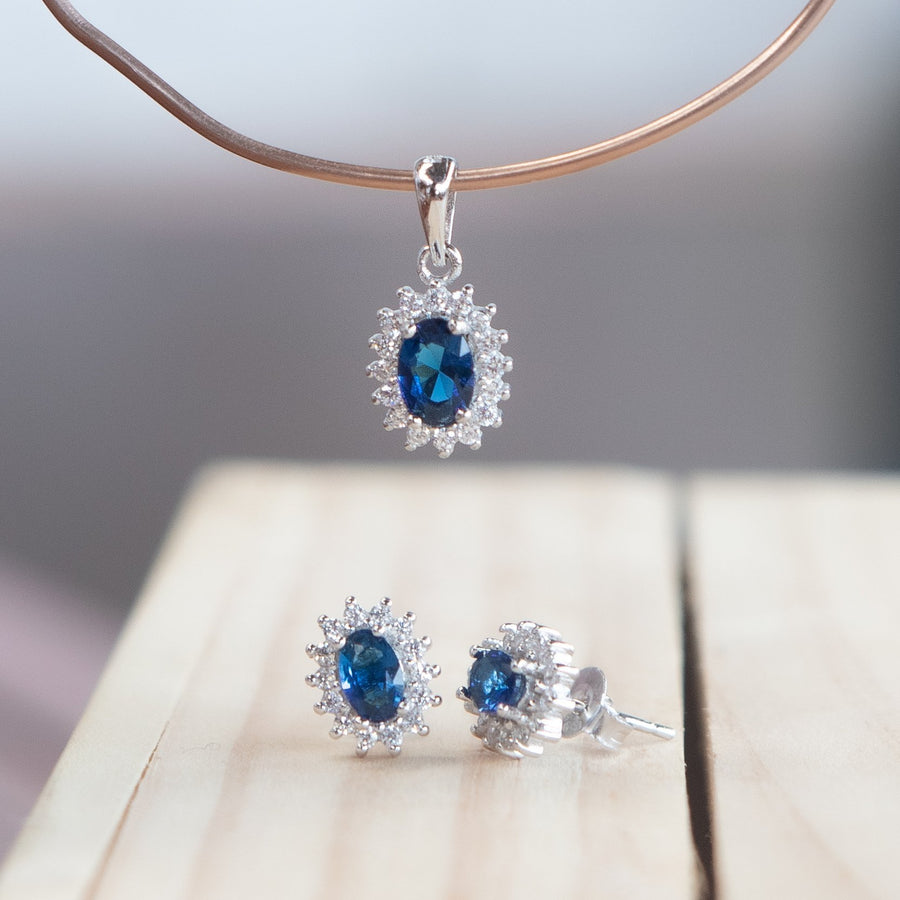 Aretes y dije de plata 925 rodinada con piedras zirconias azules ovaladas.