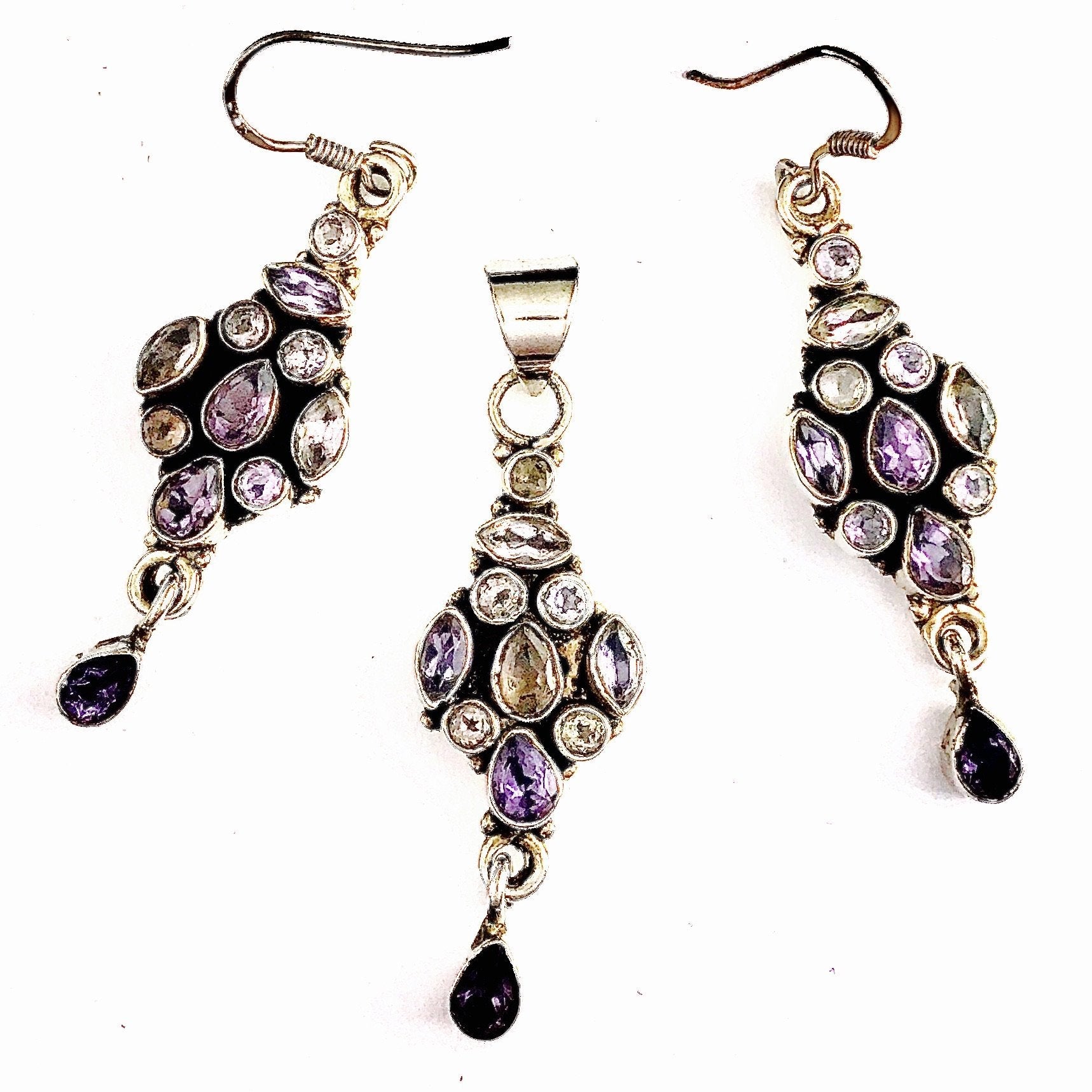 Juego de aretes y dije de Plata 925 con Piedras Semipreciosas Amatista. NO INCLUYE CADENA.