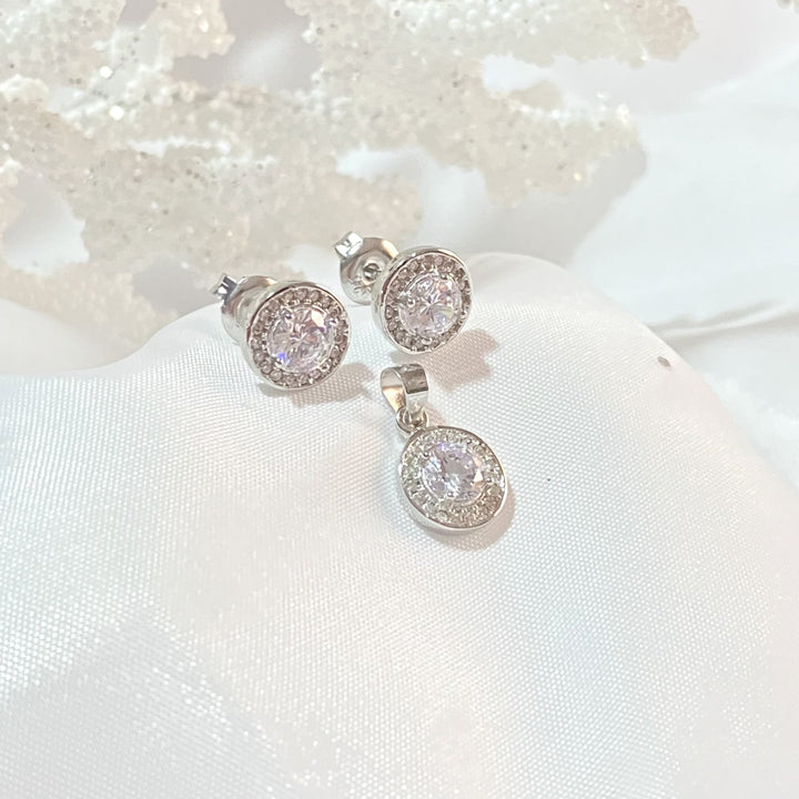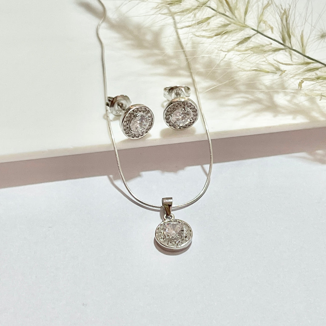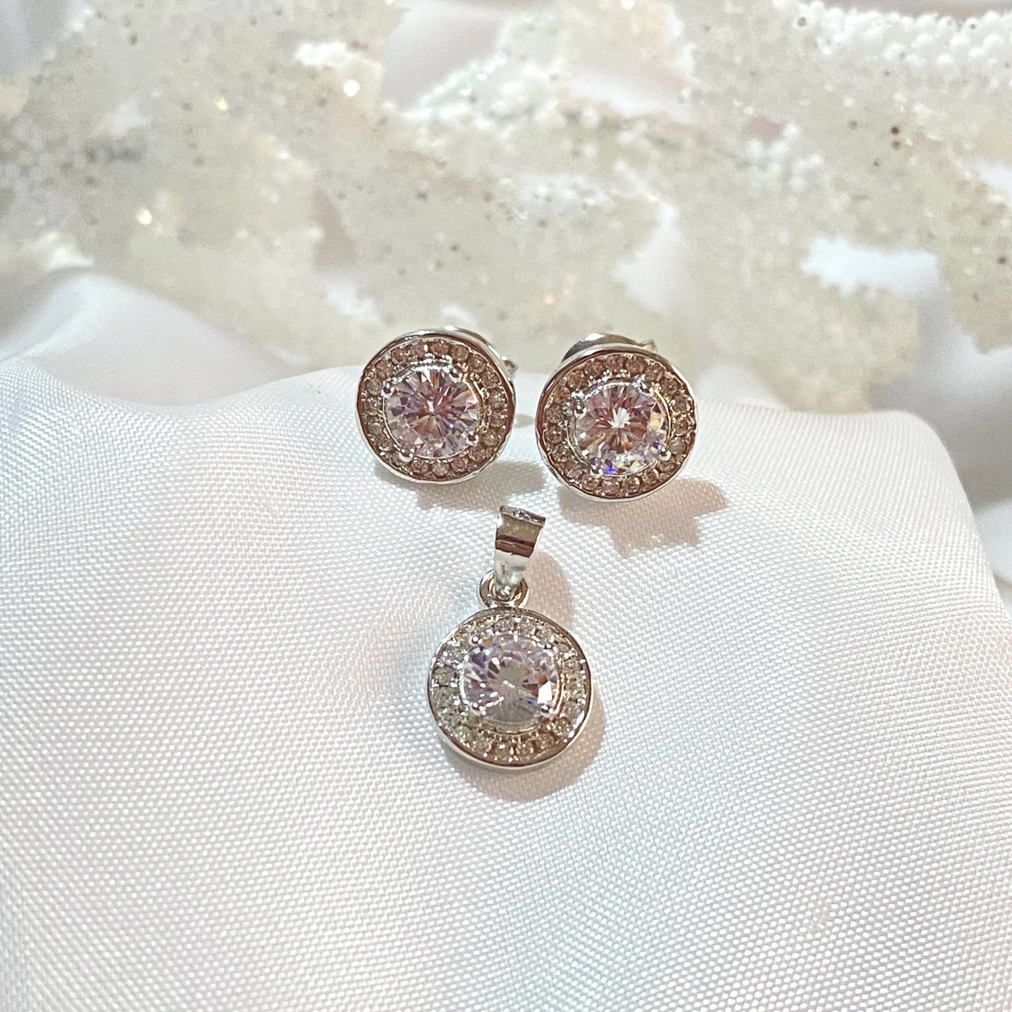 Aretes y dije de plata 925 en forma de círculos con zirconias cúbicas blancas.